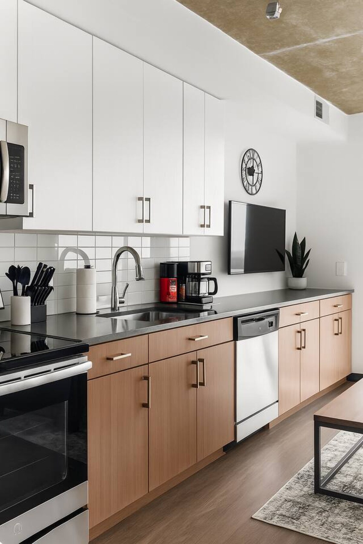 Njut av modern komfort i denna eleganta lägenhet med ett sovrum och ett badrum med två 60-tums platt-TV, en plysch king size-säng och en lyxig glasdusch. Håll dig fräsch med en tvättmaskin/torktumlare i enheten och börja dagen vid den kostnadsfria kaffe- och tebaren. Köksön med barstolar är perfekt för middag eller arbete. Detta utrymme är utformat för både avkoppling och bekvämlighet och är den perfekta flykten för alla resenärer.