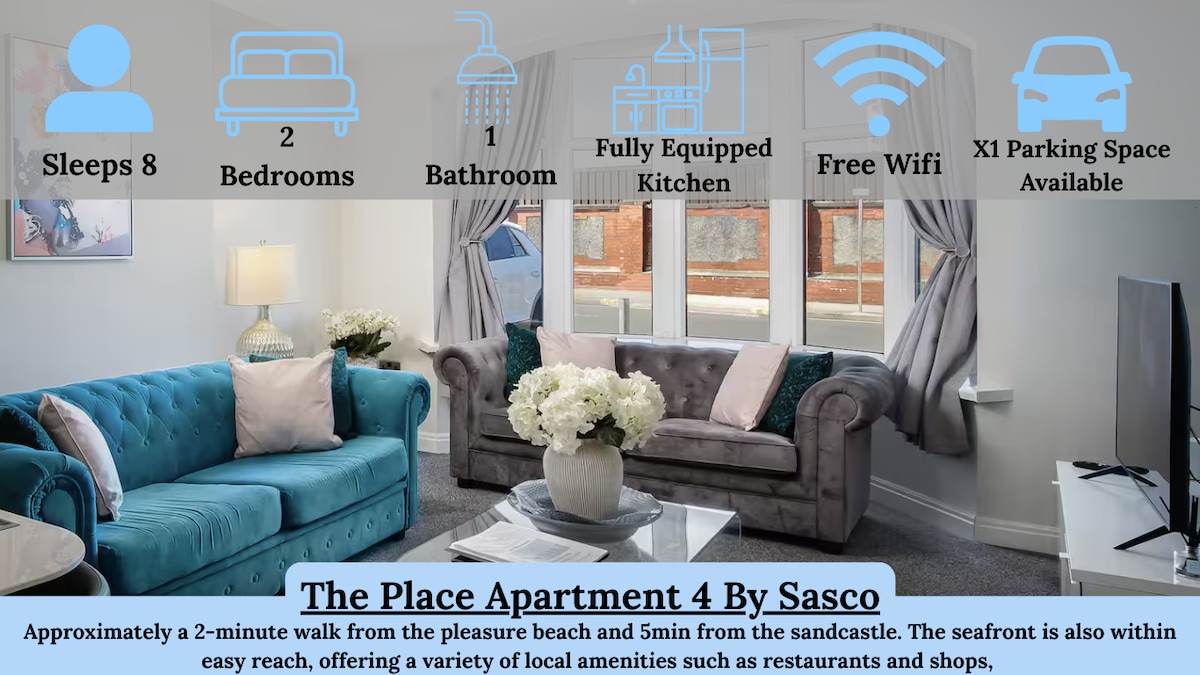 ✨Spacious 2-Bedroom Apartment next to the Pleasure Beach - Sleeps 8✨ Approximately a 2-minute walk from the pleasure beach and 5min from the sandcastle. The seafront is also within easy reach, offering a variety of local amenities such as restaurants and shops, making it an ideal location for families, contractors, and anyone looking to book a stay.