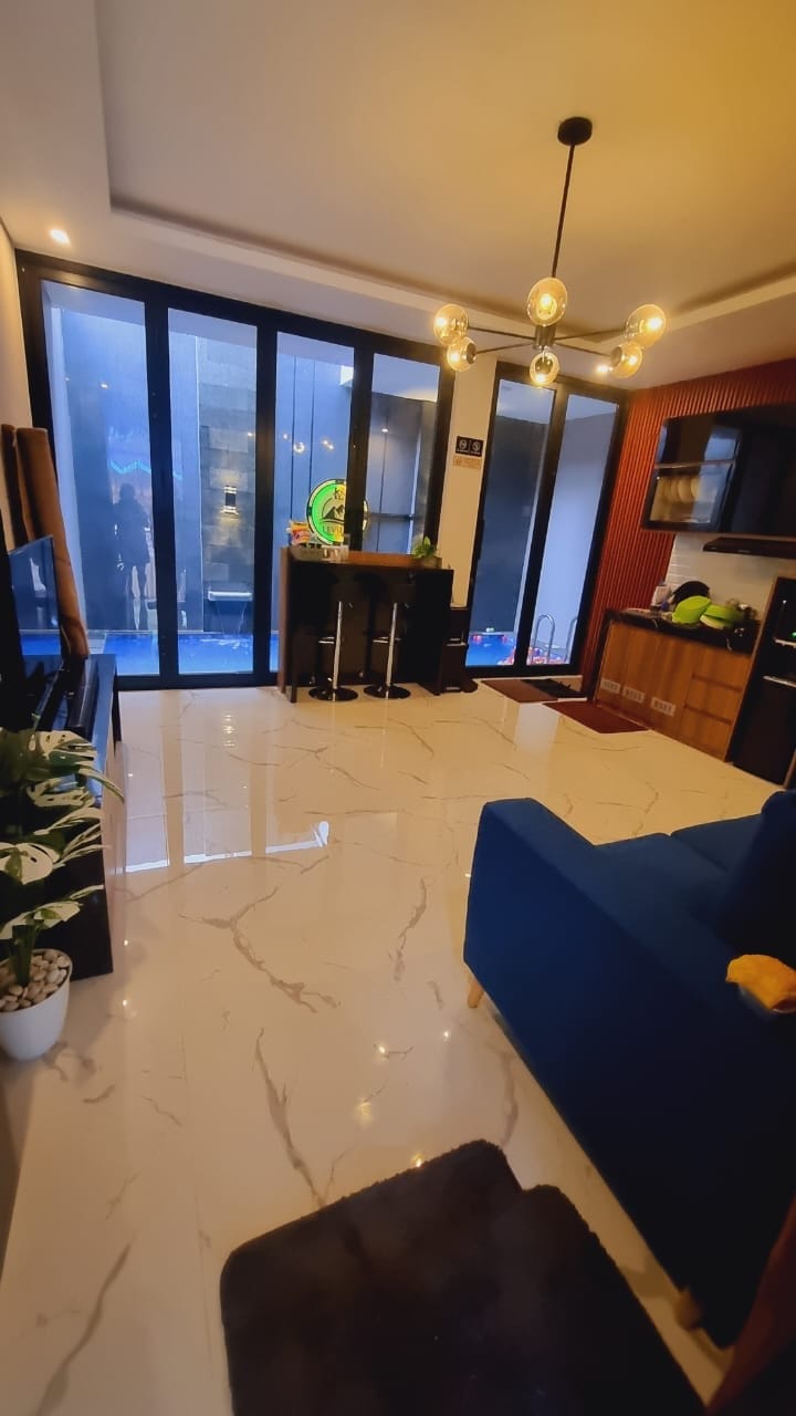 Koppla av med hela familjen på detta fridfulla ställe att bo på på. Garden-Gazebo-Fishpond 3 Lantai (takterrass - bästa utsikt) 4 km (full AC) 3 KT (dusch med värmare) Vardagsrum Wifi (Smart TV-Karaoke) Fullt fyllt kök (apparater-logistik) Rymlig balkong (bbq - barngummipool) Kylskåp - 2 enhetsdispenser Renlighet, för din familjs bekvämlighet