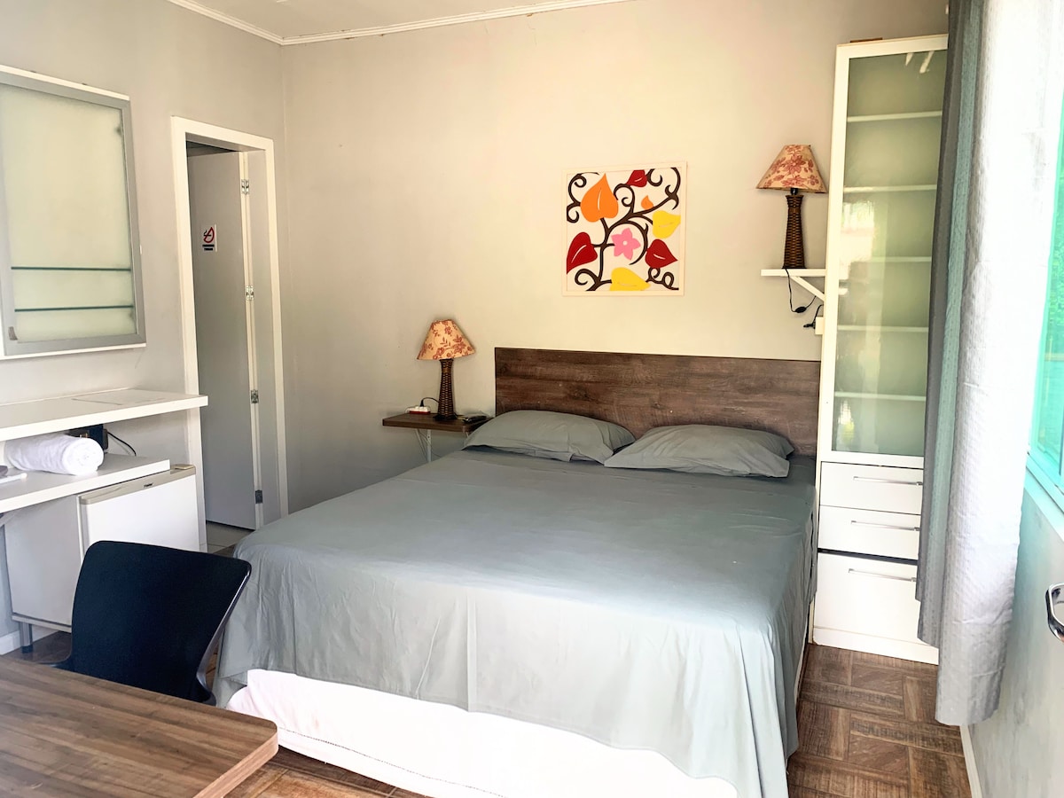 Privat utrymme på baksidan av vårt hus med parkering, grönområde. Svit med queen size-säng, luftkonditionering, minibar, wifi, TV med chromecast. Utekök med spis och mikrovågsugn. Lugnt, säkert grannskap. Enkel tillgång till centrum och BR 470. Till fots: 3 till 5 minuter från bageri, stormarknad, apotek, restaurang och bussterminal. Med bil: 10 minuter från Vila Germânica (Oktoberfest). 20 minuter från Blumenau och Pomerode centrum, och 24 minuter från Indaial. Välkomna chefer på arbete, par.