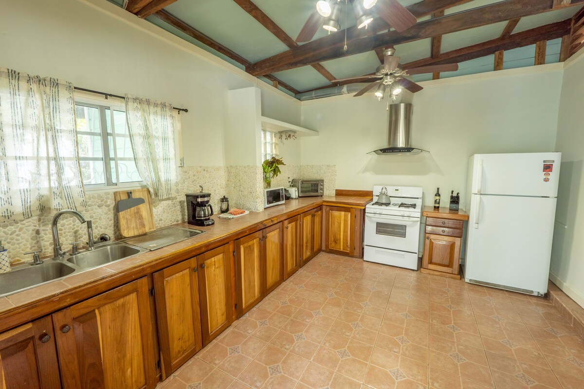Detta moderna lilla hem ligger i en vacker djungel. Njut av apor och fåglar från bekvämligheten av din lyxiga dubbelsäng, soffa eller två enkelsängar i vårt välvda loft med utsikt och sovplats. Fly värmen och insekterna med vårt AC-kyliga inomhusområde. Ett avskärmat kök med apparater för att förbereda nästan alla måltider. Och ett utmärkt badrum med privat utomhusdusch för att verkligen njuta av naturen. Vi har spel, böcker och en smart-tv för att hålla dig sysselsatt på regniga dagar. Njut!