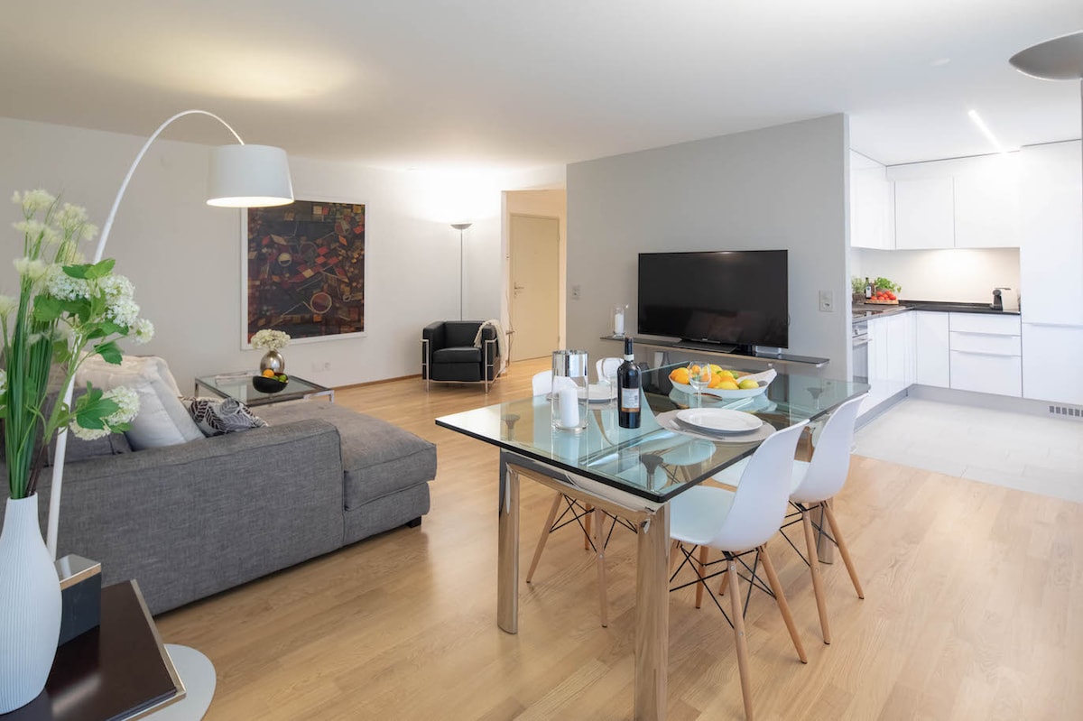 Welcome to Visionary Hospitality in Bassersdorf, Zürich. Apartment 101 is one of five at this Location. Main Advantages House => Elevator => Bus Stop in Front of House => Free Parking / Paid EV Charging Main Advantages Apartment => Garden => King Beds => Guest Bath => 75" Smart TV => Free Consumables => Free Washer / Dryer => Fully Stocked Kitchen => Iron with Board / Vacuum => Nespresso Coffee Machine, Microwave, Toaster, Kettle On Request => Vaulted Cellar for Events