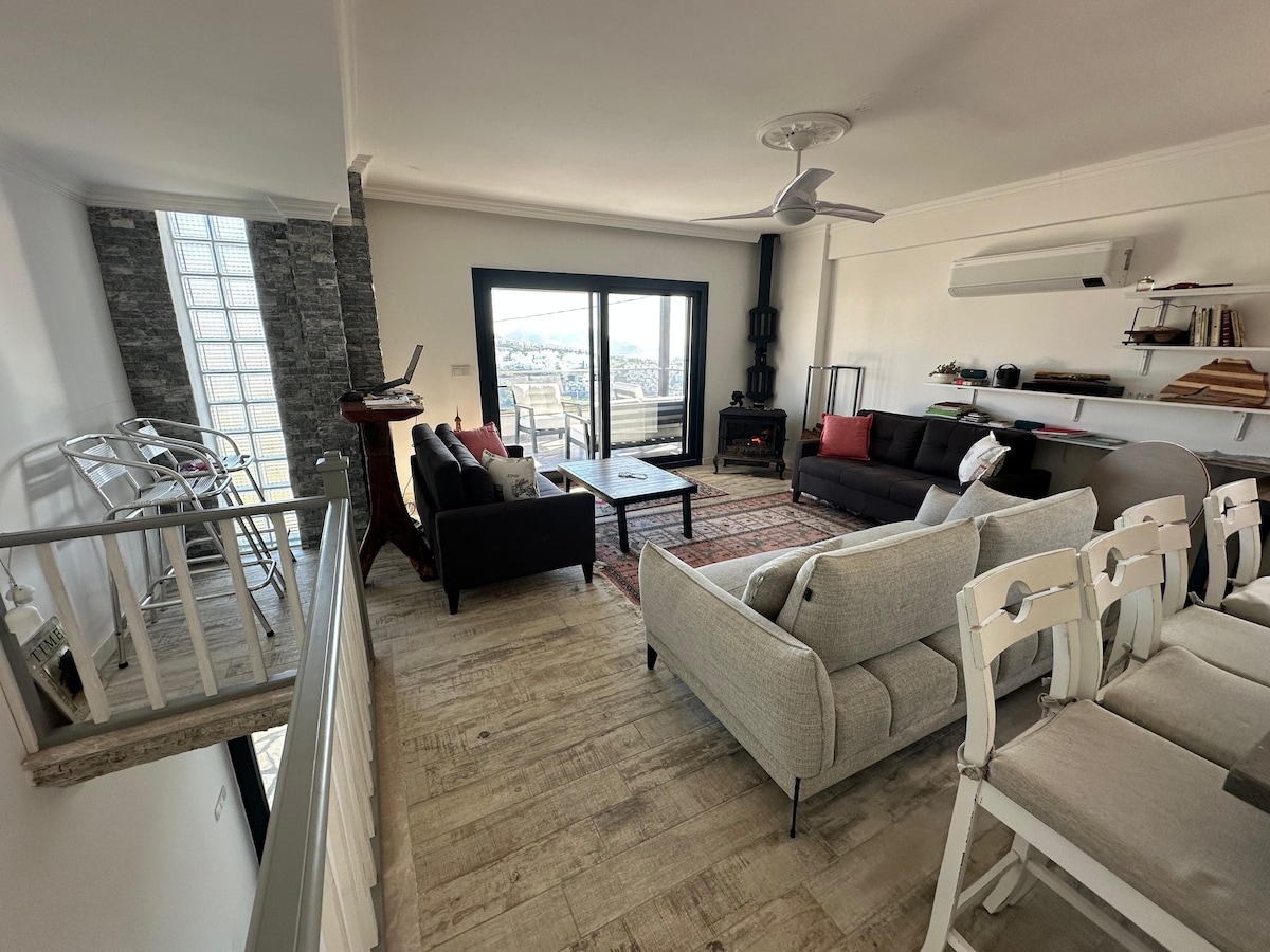 Unik helt ny villa med panoramautsikt över Bodrum och slottet i hjärtat av Bodrum. Handgjorda byggd av grekiska byggare med high-end lyxigt utrustat kök med lyxigt badrum. Inom 5 minuters promenad kan du få Bodrum Marina, njuta av barer och restauranger vår du kan delta i båtturer. One Minutes gångavstånd till kollektivtrafik så att du kan nå alla stränder runt Bodrum lätt. Villan har privat central luftkonditionering. Omgiven av ikoniska Bodrum-gator och mysig privat trädgård.