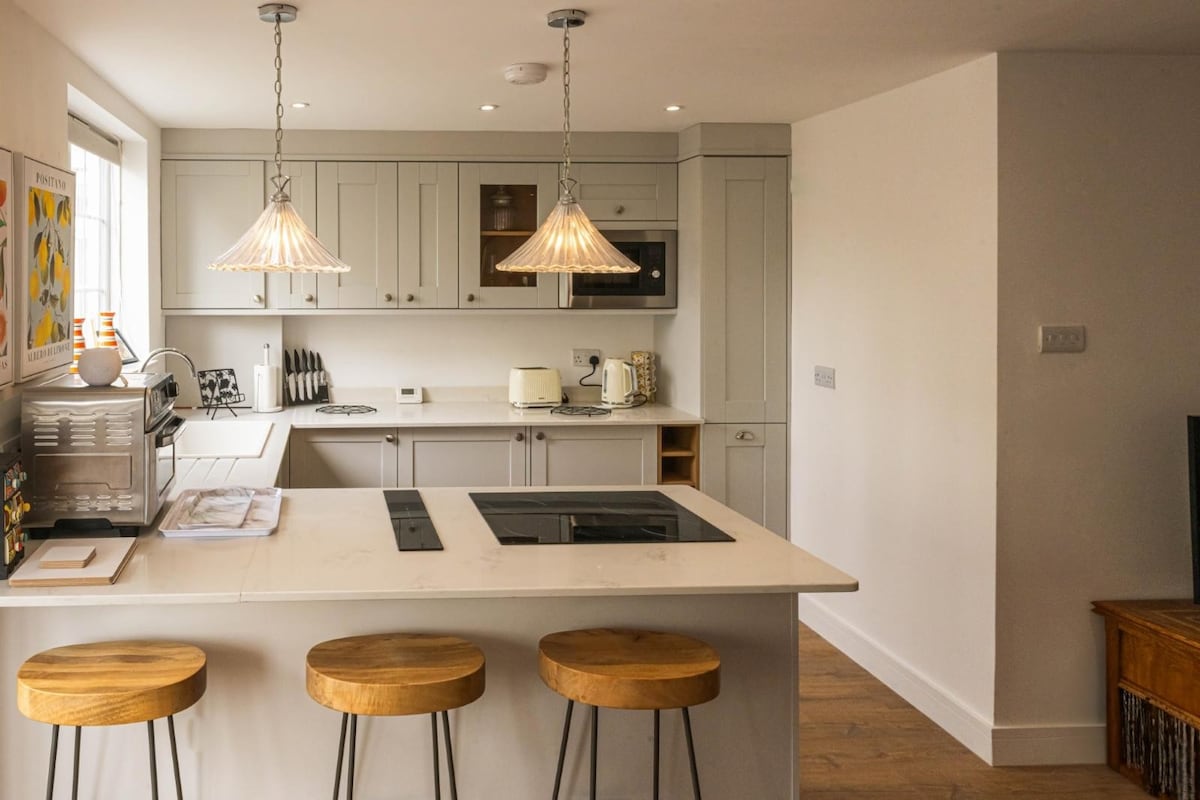 The Lookout is a 2 bedroom apartment at first floor level at the rear of the garden with a balcony overlooking fields with a view to the South Downs and Goodwood. The apartment is completely private with the owners living in separate cottages accessed by a common drive to both buildings. A maximum of 4 people can be accommodated-in this stylishly renovated apartment close to Chichester