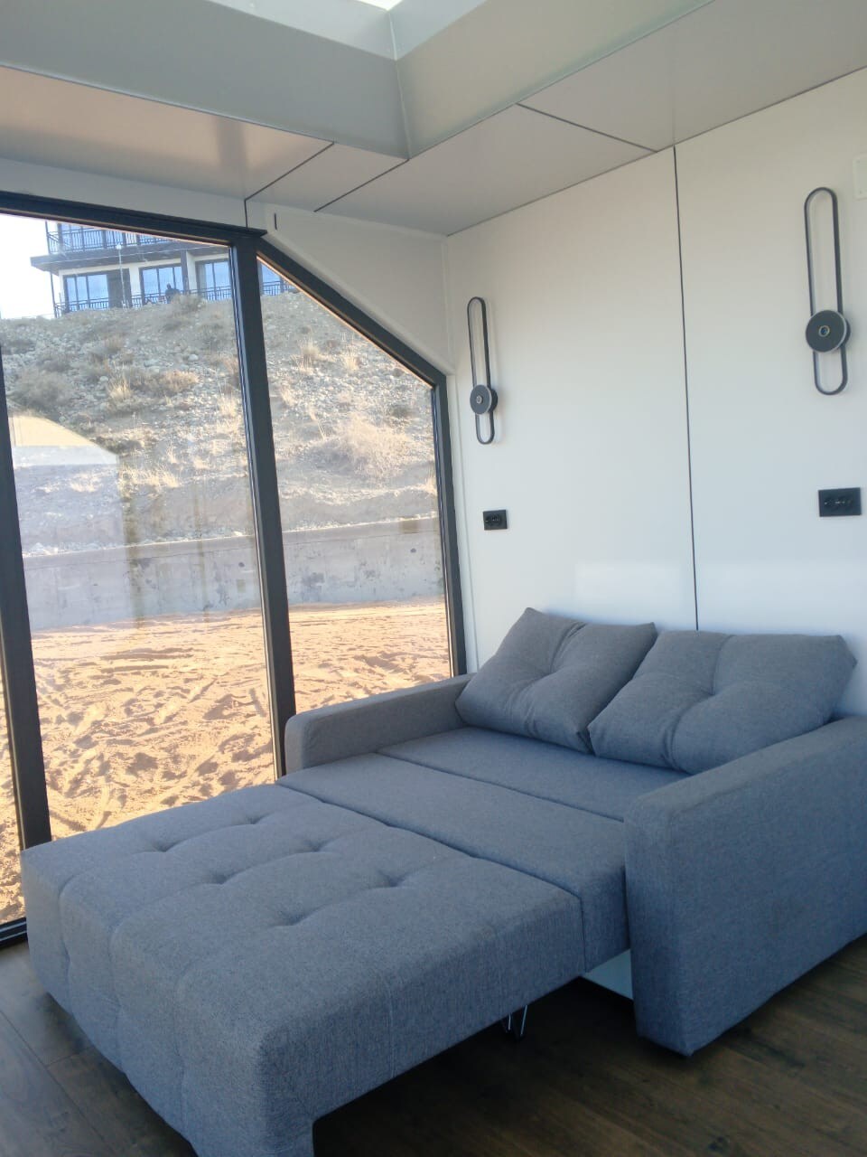 Stugan har ett rymligt, öppet vardagsrum med stora fönster som bjuder in naturligt ljus och erbjuder spektakulär utsikt över sjön och bergen. Njut av ett fullt utrustat kök, ett mysigt sovrum med mjuka sängkläder och ett badrum med moderna bekvämligheter. Det inbjudande utomhusutrymmet inkluderar en privat terrass, perfekt för avkoppling medan du tittar på solnedgången över sjön.
