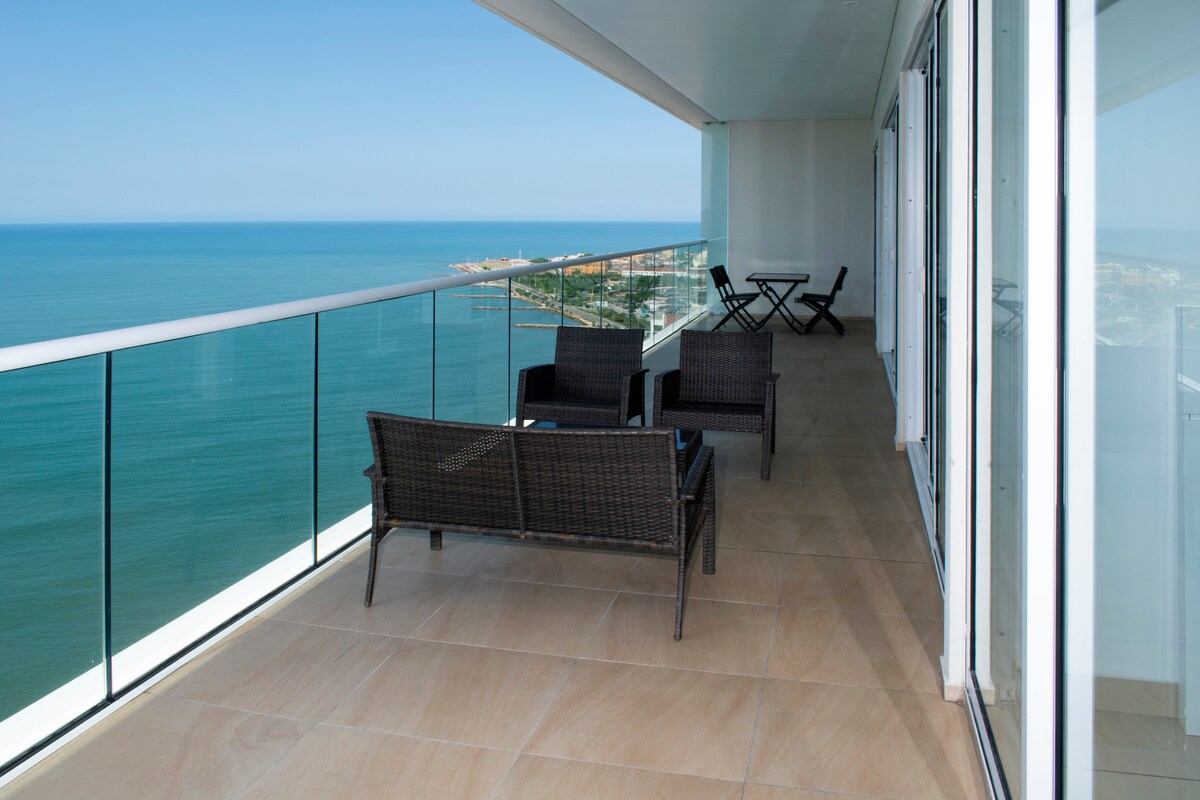 ✨ Välkommen till din tillflyktsort i Cartagena: en lyxig lägenhet på hög våning mot havet, med två privata balkonger och en 180° panoramautsikt över Karibien och bukten. Det är utformat för din komfort och har ett modernt vardagsrum med fönster från golv till tak, ett fullt utrustat kök, snabbt WiFi och digital incheckning. Njut av oändlighetspoolen, poolbaren och gymmet med havsutsikt. Beläget i Bocagrande, några steg från stranden och några minuter från Walled City. 🌊🌴