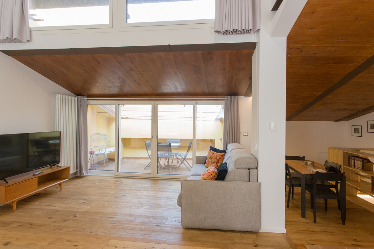 Lägenheten ligger på översta våningen i en gammal byggnad utrustad med en glaserad hiss i hjärtat av medeltida Bologna, precis framför Operahuset från 1600-talet. Mysig, panoramisk och solig, en lugn privat loggia öppnar till de inre innergårdarna med fantastisk utsikt över hustaken, sekulära tallar och de medeltida två tornen.