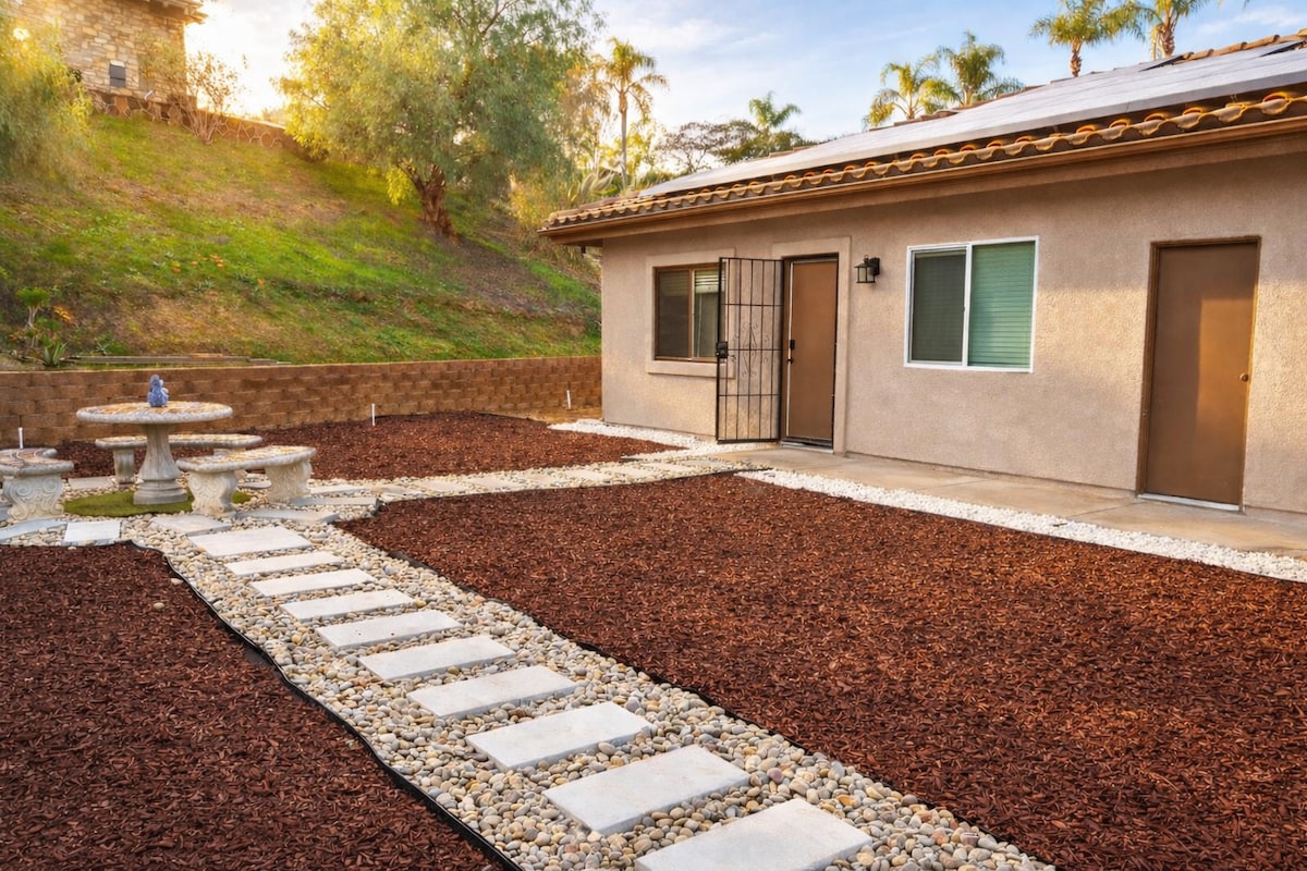 Njut av södra Kalifornien som bor i vårt fridfulla, privata, soliga casita-gästhus i Fallbrook. Familjevänligt och med ett fullt utrustat kök, är denna mysiga plats redo för en perfekt semester. Ät och koppla av bekvämt med gott om sittplatser inomhus och utomhus för upp till 6 gäster. Endast 25 minuters bilresa till Oceanside Harbor Beach, 30 min till Temecula vingårdar, 30 min till Legoland, 50 min till SeaWorld och 70 till Disneyland plus hela San Diego County på under en timme!
