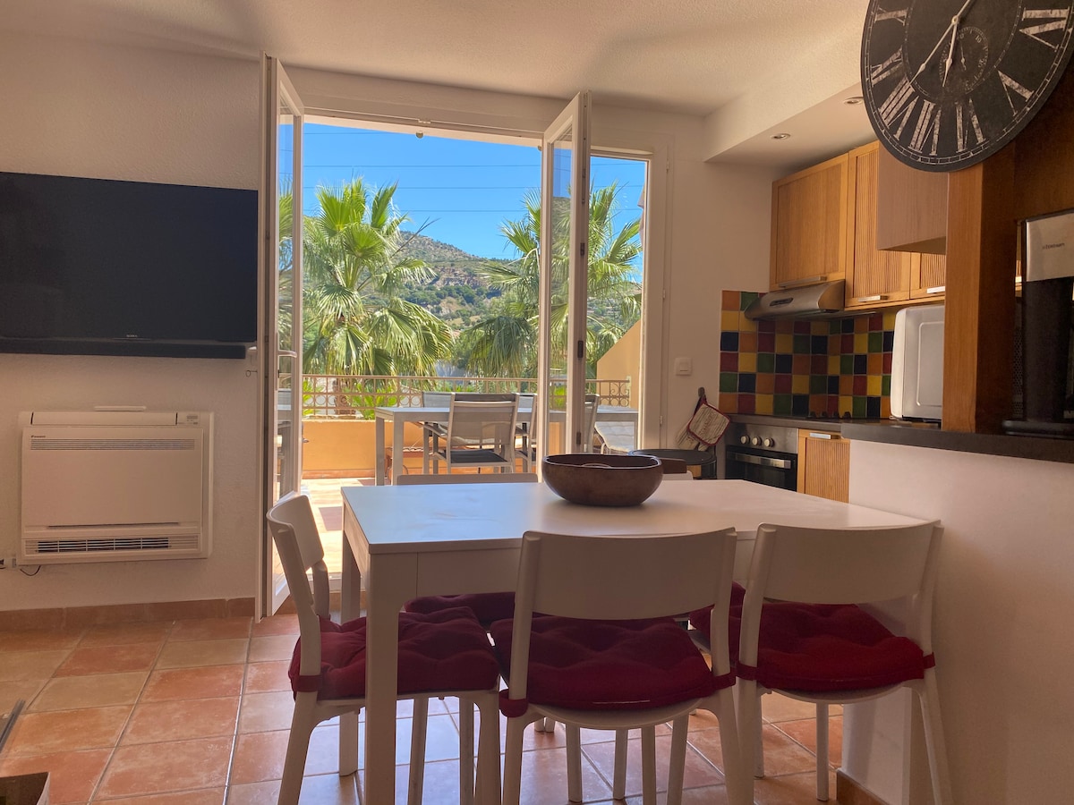 Renoverad lägenhet på den vackra och långa stranden La Bergerie Med utsikt över havet, med fötterna i vattnet direkt på stranden, välkomnar Sabine och Sébastien dig till deras magnifika moderna kokong. En riktig oas för alla som älskar havet. Du kommer inte att kunna slita blicken från det och kan njuta av soluppgången över Golden Islands från din säng. Mysig och varm atmosfär, lägenheten och dess 27 m2 stora terrass ligger i slutet av bostaden för mer avskildhet.