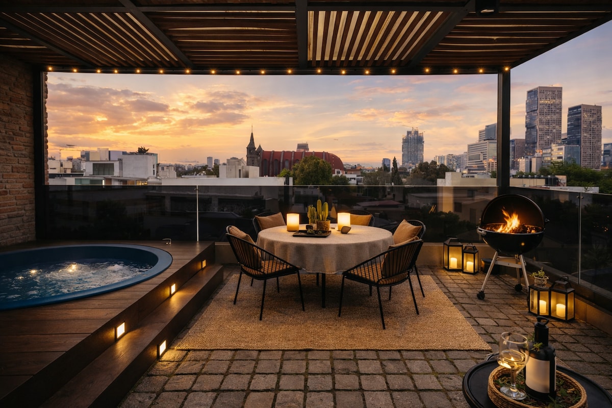 An exclusive three-level penthouse in Hipódromo Condesa, designed for guests seeking comfort, privacy, and elevated city living. Enjoy individual A/C & heating in every room, hotel-quality beds, and refined interiors ideal for relaxation or remote work. The private rooftop terrace offers open city views, an outdoor fireplace, lounge seating, and a gas BBQ—perfect for sunrise coffee or sunset evenings. Guests also enjoy access to a 22 m (72 ft) swimming pool, gym, steam rooms, and 24/7 security.