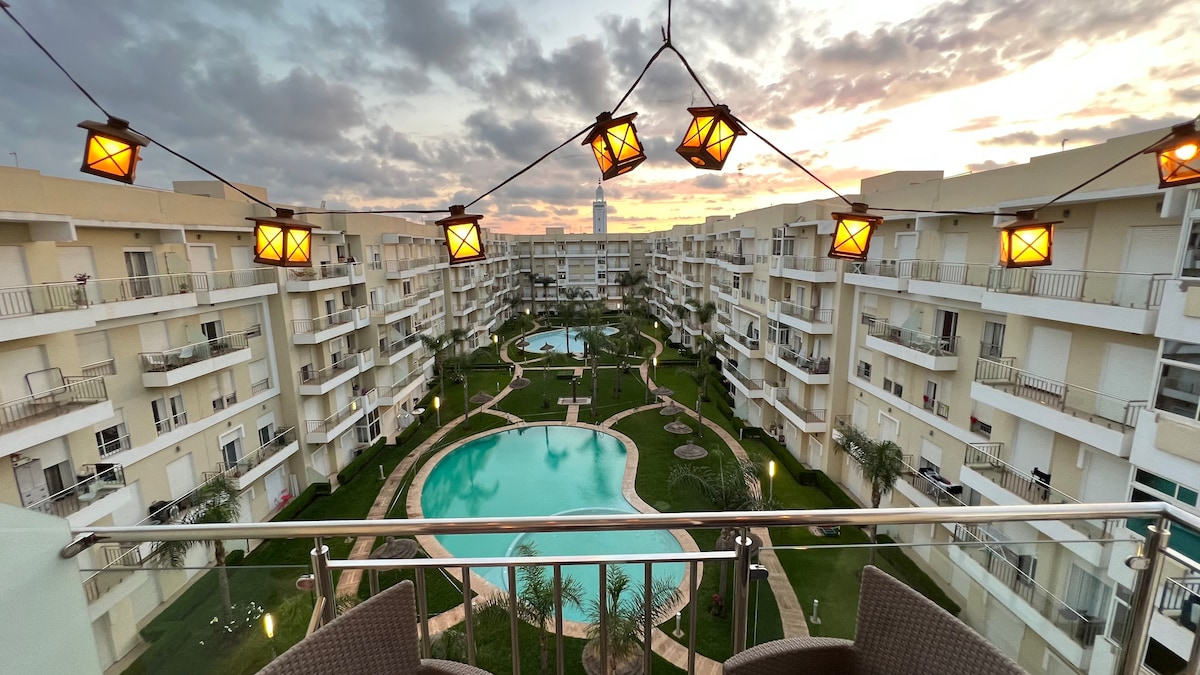 Viktigt: för varje bokning erbjuder jag dig frukost på @poundsfitkitchen, stadens bästa restaurang. Mycket vacker ny lägenhet i en vacker lugn bostadsanläggning. Lägenheten är ensam på våningen med utsikt över poolen. Perfekt för resenärer och familjer som vill njuta av de vackra stränderna i Mohamadia. De kommer att finna sin lycka med tillgång till poolerna och de olika lekplatserna för barn samt tennis- och fotbollsplanerna. Tillgång till stranden 5 minuters promenad