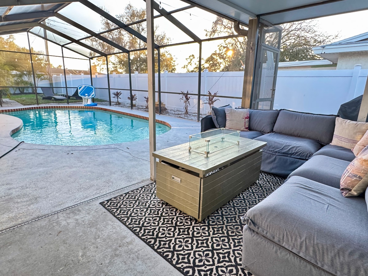 Välkommen till Citrus & Serena Stays, din privata tropiska oas perfekt för stora familjer eller grupper! Nära Bradentons attraktioner, inklusive Anna Maria Island, har detta boende en skärmad uppvärmd saltvattenpool, elektrisk massagestol, eldstad och mycket mer. Med sin lekfulla apelsin-fruktiga inredning är den idealisk för en oförglömlig semester ☀Bradenton Beach - 12 min ☀Riverwalk - 10 min ☀Anna Maria Island - 12 min ☀Img Academy - 10 min