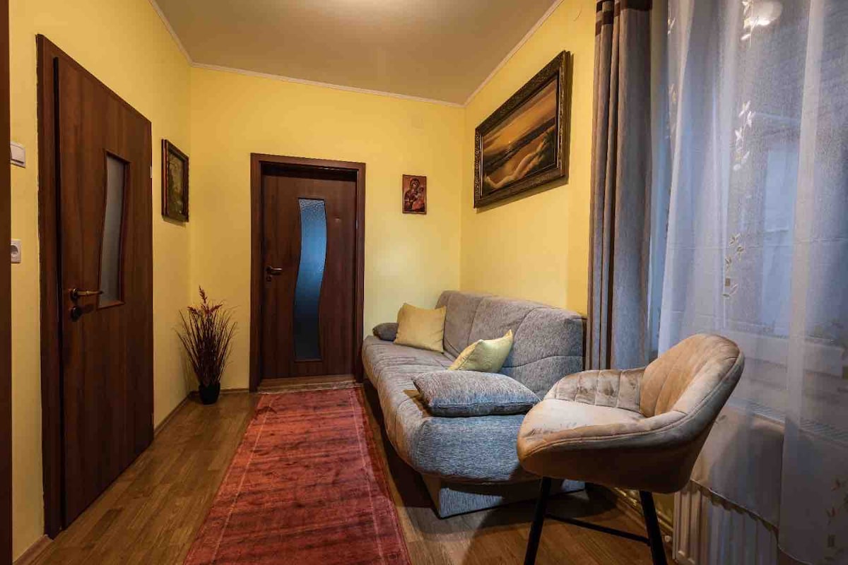 Vi välkomnar dig till vår nya charmiga lägenhet belägen i den "yaste delen av Brasov. Fullt möblerad, ett sovrum med en generös dubbelsäng och en mysig fönsterplats, ett retro badrum med dusch, ett vardagsrum med bar, öppen spis, en bekväm soffa och ett fullt utrustat kök, i öppet utrymme. Lägenheten ligger 5 minuters promenad till Coresi Shopping Center och 20 minuter med buss till Gamla stan (4 km avstånd). Tågstationen ligger 15 minuter med buss (2 km).