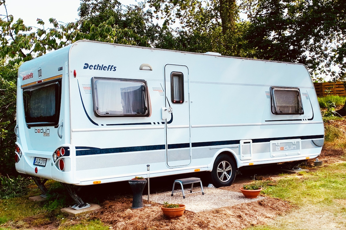 Vår kärleksfullt byggda byggvagn erbjuder den perfekta platsen plats för att koppla av. Trädgården är stor och mycket, mycket grön, du kan höra grodor och tranor, och på kvällen kan du se fladdermöss. Grenz är lugnt, orört och mitt i naturen. Huset där vi delar kök, badrum och matsal med dig är ca. 400 meter från husvagnen. Det finns också Wi-Fi där.