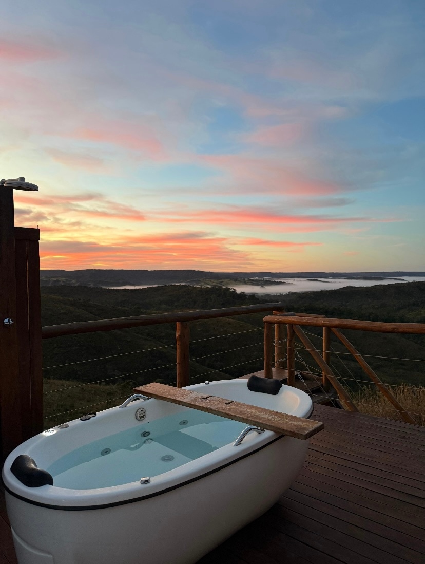O espaço conta com uma jacuzzi grande com aquecimento a gás, que mantém a água quente mesmo à noite e em dias frios, perfeita para relaxar enquanto aprecia um pôr do sol incrível nas montanhas. Um dos diferenciais é a cama com trilhos que se estende para fora do bangalô, com colchão queen de molas ensacadas, permitindo descansar ao ar livre. O bangalô possui banheiro rústico elegante, com torneira e chuveiro no teto. Projetor de cinema e cozinha em ilha de frente para a vista das montanhas.