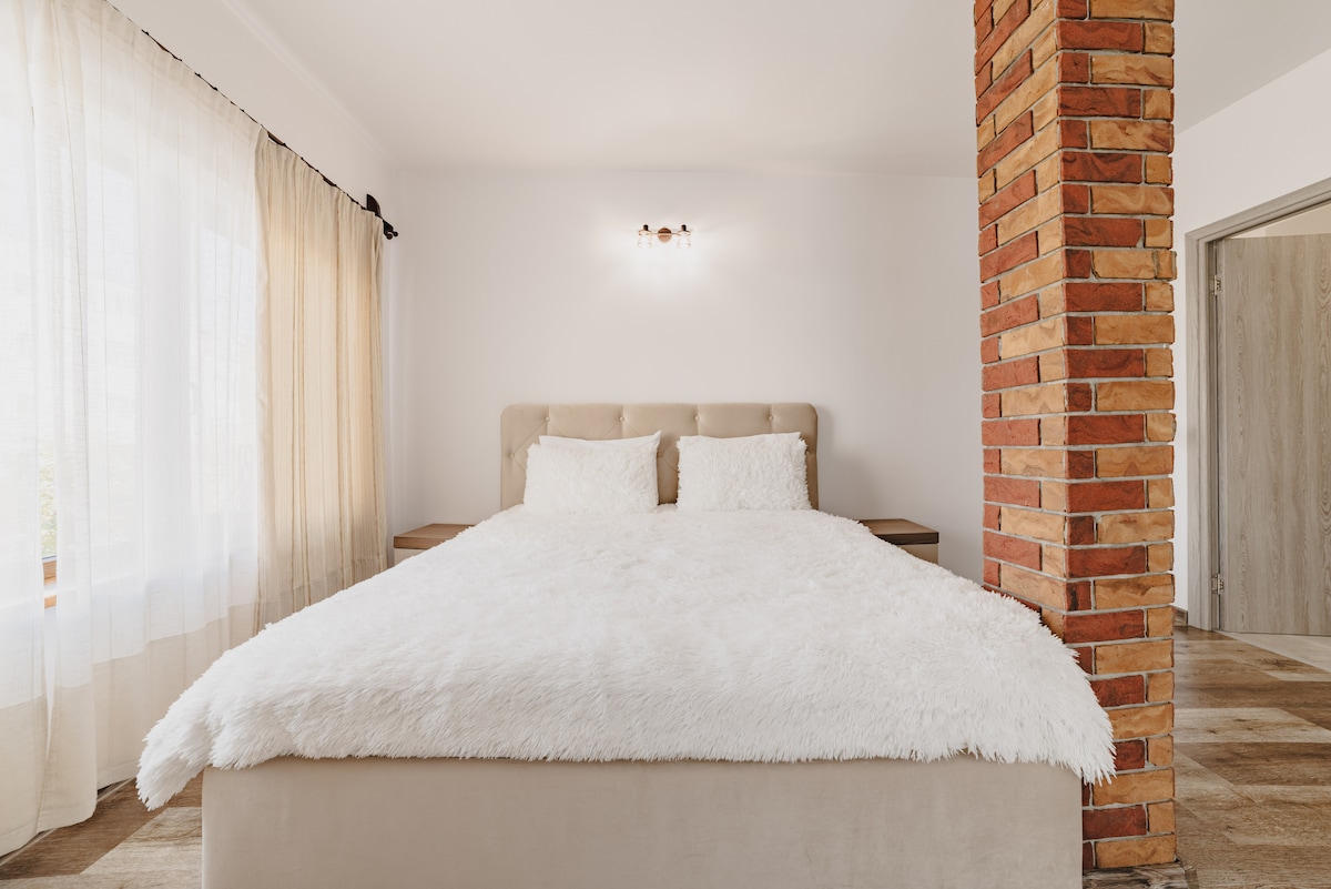 Njut av en lugn och bekväm vistelse i denna privata studio i Villa 1 i Hanul Anei, perfekt för familjer eller par med ett barn. Studiolägenheten har en dubbelsäng för vuxna, en utdragbar fåtölj för ett barn, ett eget badrum och ett fullt utrustat pentry. Gå ut till gården, parkera säkert och koppla av efter en dags utforskning av Brasov. Valfri utomhusjacuzzi ger en speciell touch. Boendet erbjuder lugn, avskildhet och alla bekvämligheter hemifrån samtidigt som det är nära stadens sevärdheter.