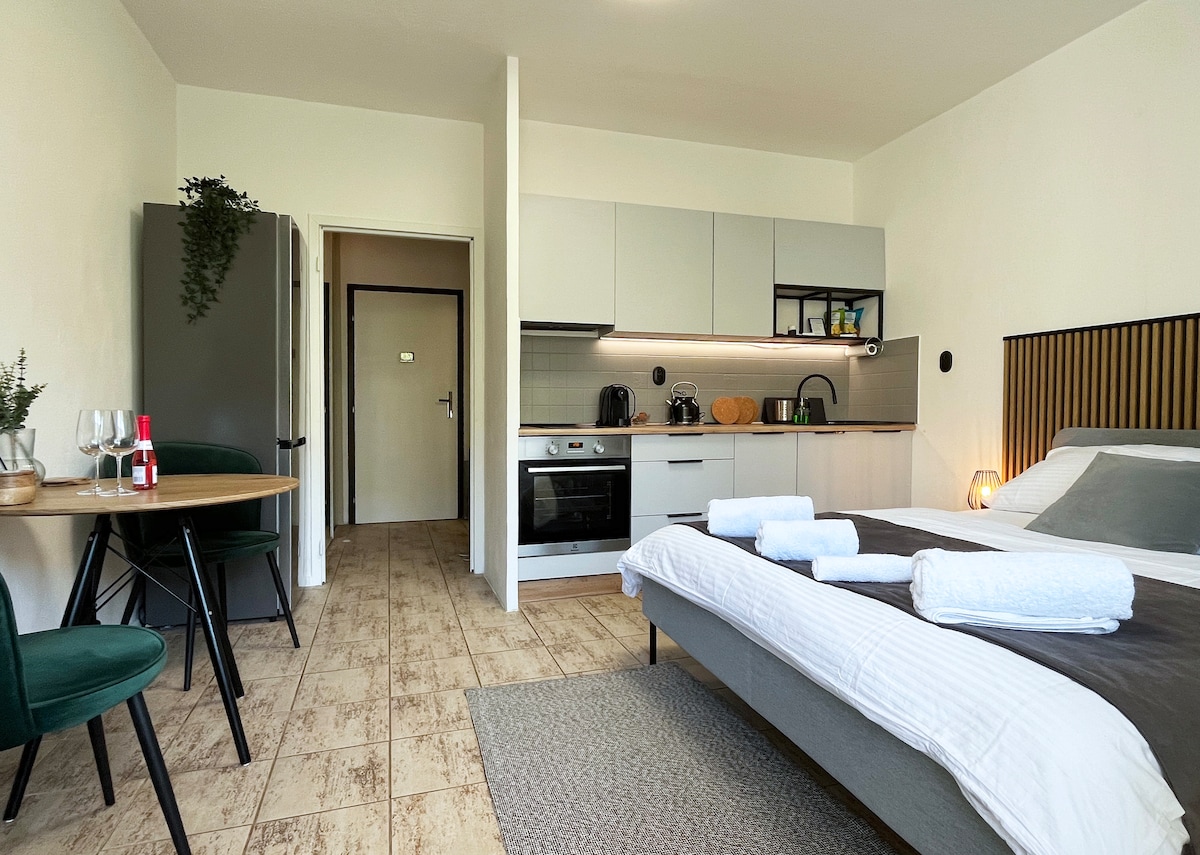 Renoverad, elegant och luftkonditionerad studio med mysigt balkongutrymme, fullt utrustat kök, bekväm dubbelsäng välkomnar gärna sina gäster. Det finns ett betalt parkeringsalternativ på 12 euro/dag runt lägenhetsbyggnaden. Gratis parkering på lördagar. Fördelen med detta läge är gångavstånd till Donau och centrum. Naturligtvis finns det internetuppkoppling, TV, Netflix, lakan, handdukar, kaffebryggare, hårtork och strykjärn. Möjlighet att använda minibaren.
