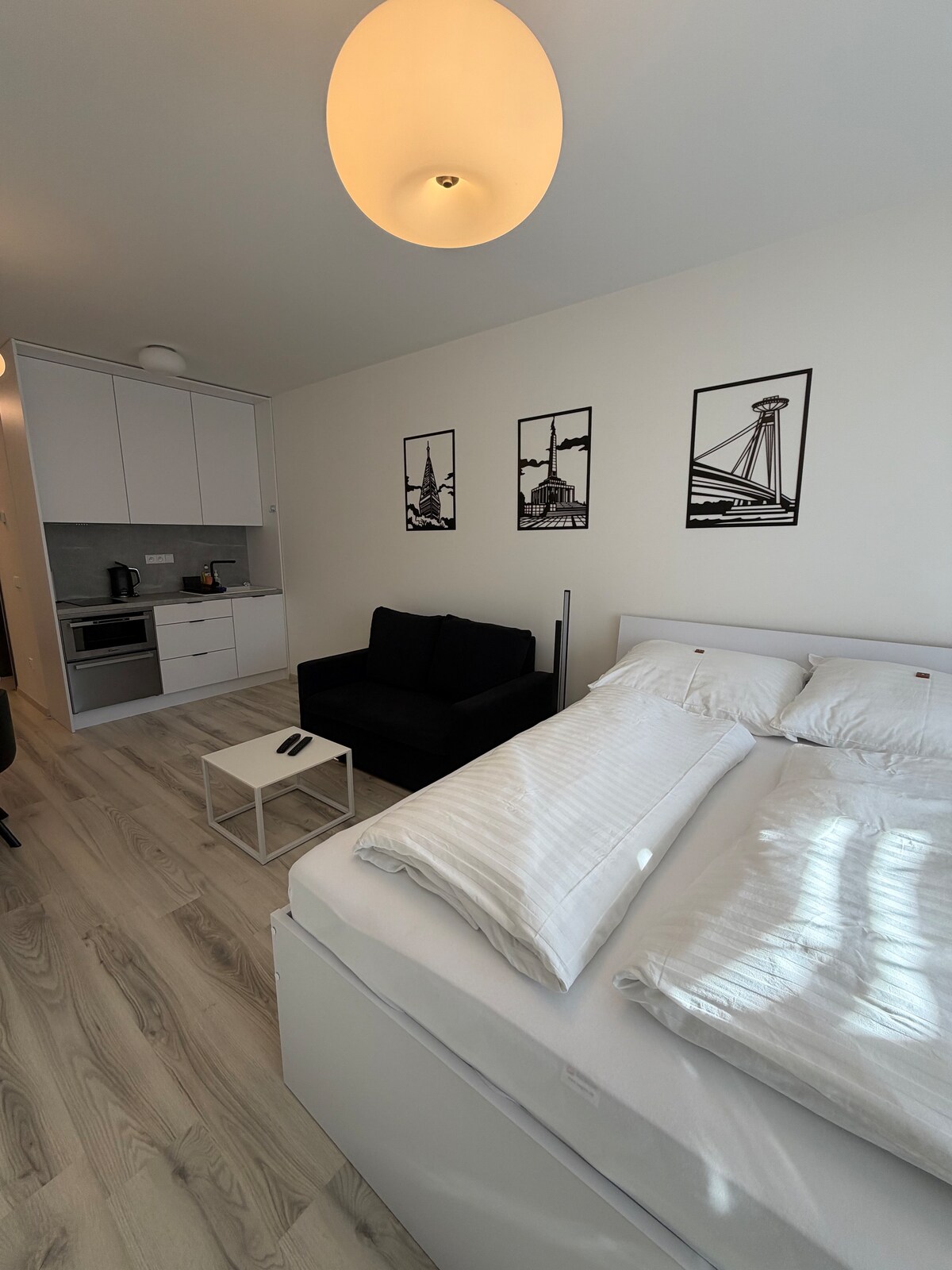 Njut av komfort och stil i denna moderna enrumslägenhet som ligger direkt ovanför OC Tehelko shoppingcenter. Oavsett om du besöker Bratislava för affärer, en weekendresa eller bara letar efter ett mysigt ställe att bo på kommer du att känna dig som hemma här.