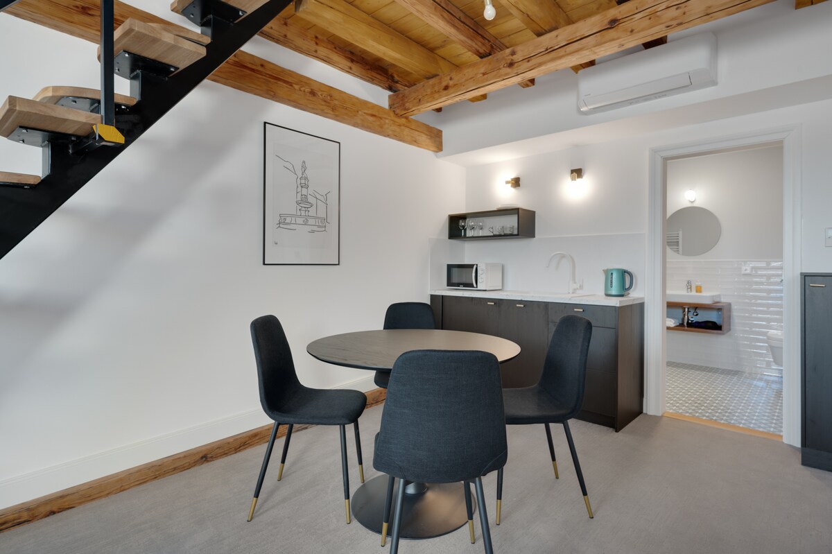 Utformat för din komfort, precis som ditt eget hem. Snygg lägenhet på 45 kvm med möjlighet att välja mellan dubbelsäng eller två enkelsängar. Vardagsrummet är kombinerat med ett välutrustat kök. Storleken på lägenheten gör det möjligt för högst 3 personer att sova tack vare utrymmet för en extrasäng. Boendena har utsikt över den intilliggande gatan eller hotellets innergård med parkeringsplatsen. Lägenheten är perfekt för längre vistelser!