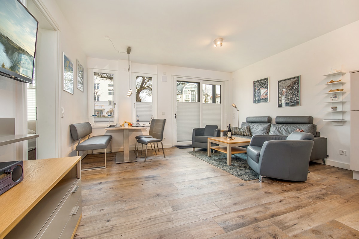 Vår lägenhet Lore är en del av en högkvalitativ, lugn 3-fest Bauhaus villa, 120 meter från Rügens vackraste strand - den 8 km långa "Schaabe". Här finns ett rymligt vardagsrum med en stor soffa och fullt utrustat kök, bastu (3,-€/h), öppen spis, 2 sovrum, var och en med eget badrum, och en rymlig terrass i söderläge. Juliusruhs centrum med restauranger, kaféer, bagerier etc. ligger ca. 300 meter bort. Rügens främsta attraktion Cape Arkona ligger idylliskt inom cykelavstånd.