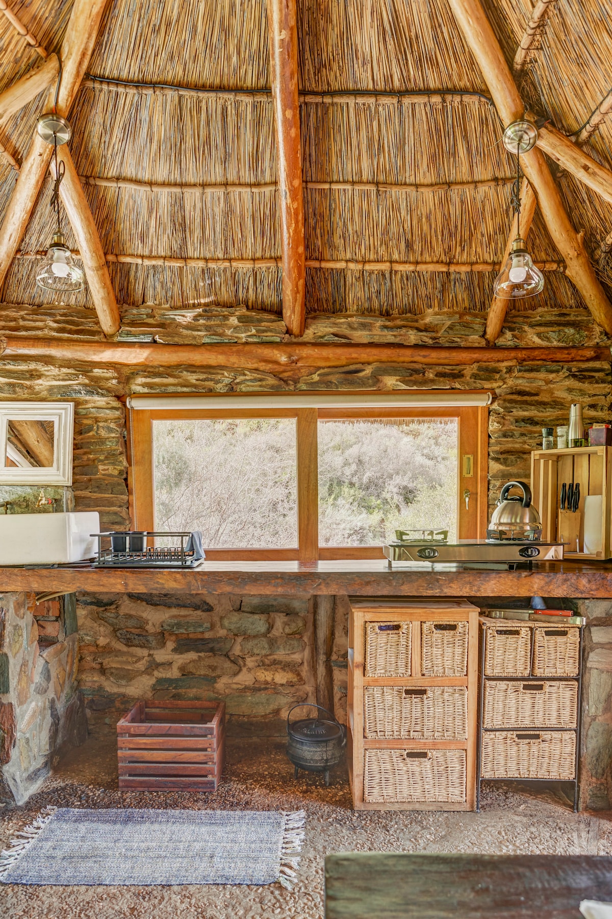 Ljuden av naturen och vacker 360° utsikt kan uppskattas från din egen stenstuga Detta är var namnet Saggy Stone kommer från för vårt bryggeri. En stuga i bergen ovanför vår gård där du kan njuta av en romantisk semester — sitta i bubbelpoolen och titta på natthimlen. En av två exklusiva enheter gömda i kloof, du känner dig långt bort från stress och bekymmer i vardagen. Bäst åtkomst med en 2x4, 4x4 eller SUV (bakkie)