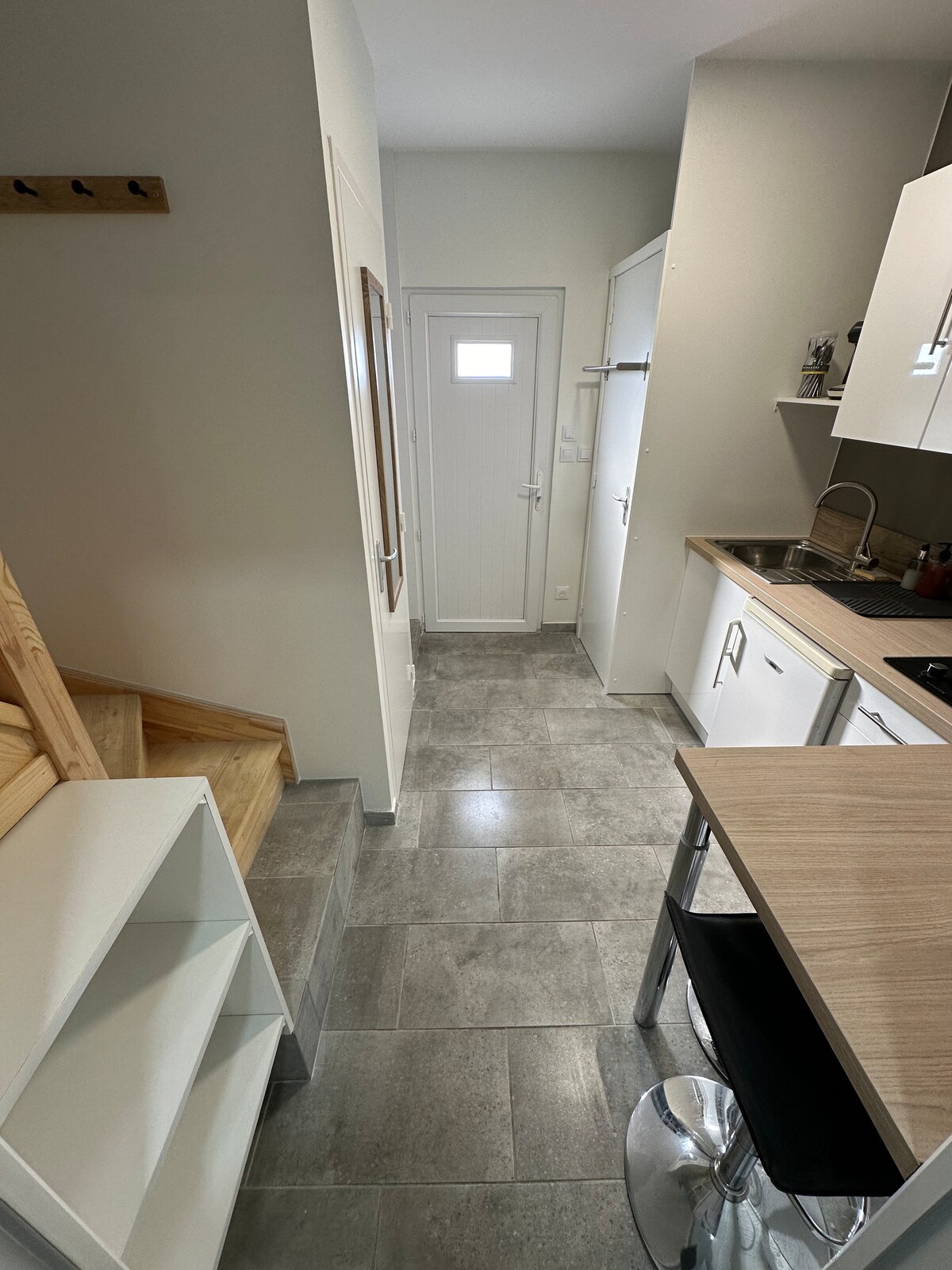 boende med kök (kylskåp, spishäll, mikrovågsugn, Senseo-kaffebryggare, vattenkokare, brödrost. Vardagsrum med matplats och sovplats: bz för 2 i 140 cm, badrum med toalett, rum med tillgång till våningen via trappa med 12 steg. säng 140 för 2 personer - hopfällbar barnsäng med madrass, barnstol, säker parkering för bilar och innergård för motorcyklar, by med alla bekvämligheter (bageri, livsmedelsbutik, postkontor, catering) 3 km till stormarknad.