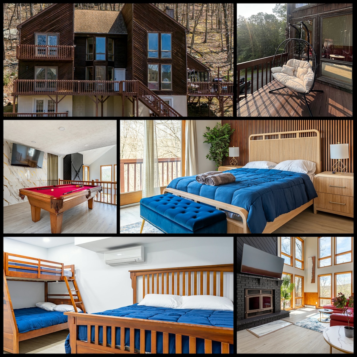 VÄNLIGEN VÄLJ "VISA MER" FÖR ATT SE VANLIGA FRÅGOR LÄNGST NED FÖR INFORMATION OM HUSDJURSPOLICY, VED OCH MER. Kom och bo i vår skogsfantasibostad i Poconos, där varje sovrum är inspirerat av årstiderna. Njut av det omgivande däcket, picknickbordet omgivet av träd och röken/grillen. Vi har tvättmaskin/torktumlare, fullt utrustat kök och 2 fulla badrum. Vi ligger i närheten av Bushkill Falls (10 min), Shawnee Mountain (15 min), Delaware Water Gap (20 min). Boendet ligger i ett gated community med många bekvämligheter för gäster.