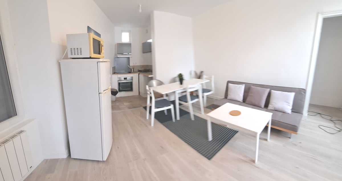 Studio på 32 m2, perfekt för upp till 2 personer. Beläget i ett lugnt bostadsområde, 5 minuters promenad från järnvägsstationen, köpcentret Le SPOT och spårvagnen. Om: Självständig ✦ankomst från 16:00 tack vare vårt anslutna lås. ✦Bekväm bäddsoffa 160x200 cm, för avkoppling. Fullt ✦utrustat kök med tvättmaskin för dina behov. ✦Gratis Wi-Fi-anslutning obegränsad tillgång till internet. ✦Omklädningsrum som hemma. ✦Kaffe och te gratis: vid ankomsten, erbjuds av huset.