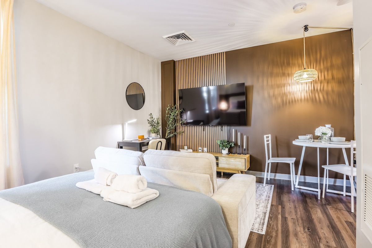 Upplev Boston i denna otroliga iögonfallande studio. Levereras med en rumsavdelare för 1 sovrum som känsla! Bara 5 minuters promenad från T och nära Boston College/Harvard, kan du engagera dig med hela Boston smakfullt. Enhetsfunktioner -> Blazing Fast WiFi -> 65" SmartTV med streaming -> Fullt utrustat kök -> Tvättmaskin och torktumlare -> Komfortabel dubbelsäng Perfekt för affärsresenärer, par, sjuksköterskor, de som arbetar på sjukhus och alla som vill uppleva Boston i komfort och frid.