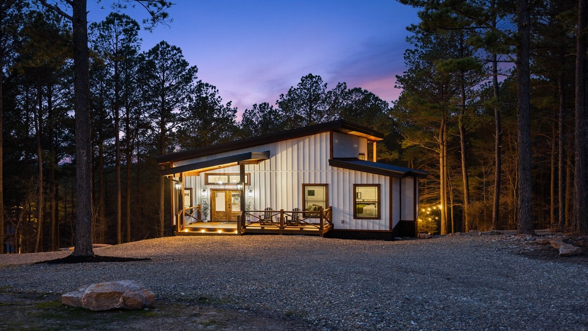 Modern lyxstuga | 2 sviter med dubbelsäng • Elbilsladdare • Husdjursvänlig Upptäck The Modern – en fantastisk, designinriktad stuga på 3,5 privata tunnland i Broken Bow. Med höga 18 fots tak, stora fönster, ett helt vitt kockkök, vedspis och 2 lyxiga king-sviter (en med badkar). Njut av skogsutsikt, mys vid elden och ladda din elbil på plats. Hundvänligt också! Boka din oförglömliga resa idag.