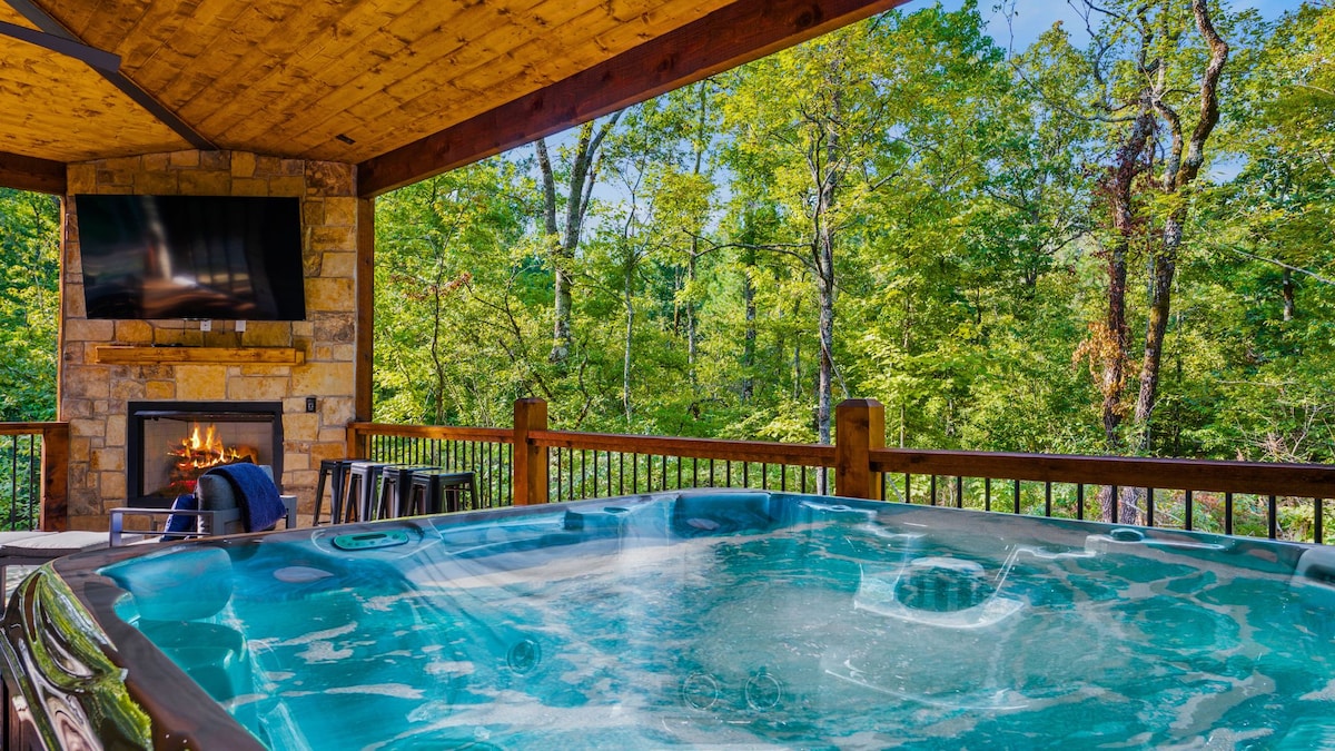 Detta lyxiga skogsboende ligger bland tallarna och rymmer 17 personer och har ett privat filmrum med 86-tums skärm, bubbelpool, omslutande däck, eldstad, arkad, shuffleboard och mycket mer. Hundvänligt (max 2, 150 USD/hund). 🎬 Filmrum | 🛁 Bubbelpool | 🔥 Eldstad | 🎮 Arkad 🧒 Lekset | 🐾 Hundvänligt | 📡 Hulu + Disney+ ✭ "Teaterrum, lekplats och omslutande veranda var precis vad vi behövde för att varva ner!"