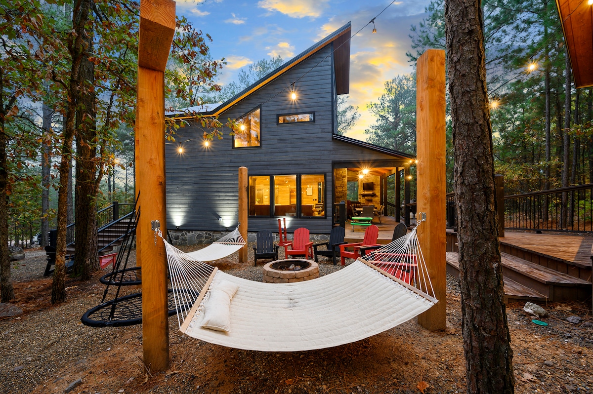 Total: 4 Bedrooms | 6 Beds | Sleeps 10 Welcome to The Barndo, a new modern luxury cabin designed for families to share. Located in the heart of Hochatown and featuring an amazing outdoor space with hot tub, porch swings, outdoor fireplace, grill, foosball, 65" 4K TV, and dining table. The large circle driveway is perfect for towing your boat or charging your Tesla. A short 2 min ride to Hochatown/Broken Bow attractions! 2 King Bedrooms w/ ensuite baths on main floor 2 Bunk Rooms w/ Queen/Twin