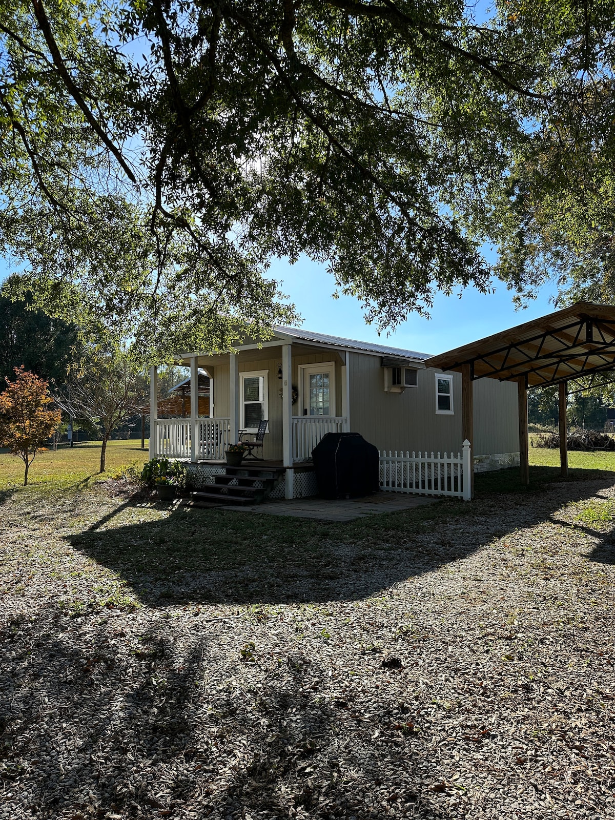Escape to a rustic haven on our mini farm! Our cozy cottage boasts idyllic views of mature pecan trees and a peaceful atmosphere. Step inside to find a farmhouse-decorated space with an equipped kitchen, a snug living area, and a comfy bedroom. Enjoy morning coffee on the porch or go for a walk through the pastures. Ideal for a getaway, our cottage offers a slice of countryside charm just a short drive from local attractions. Book now for a delightful retreat into nature!