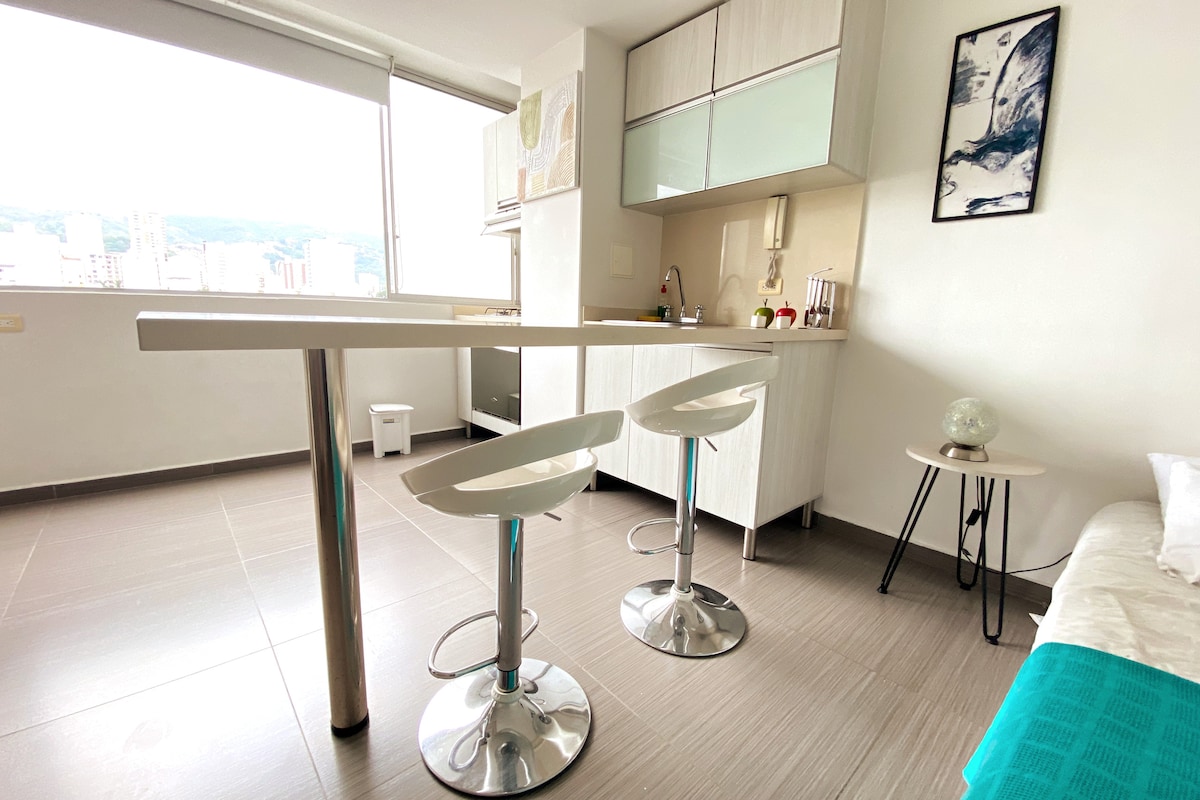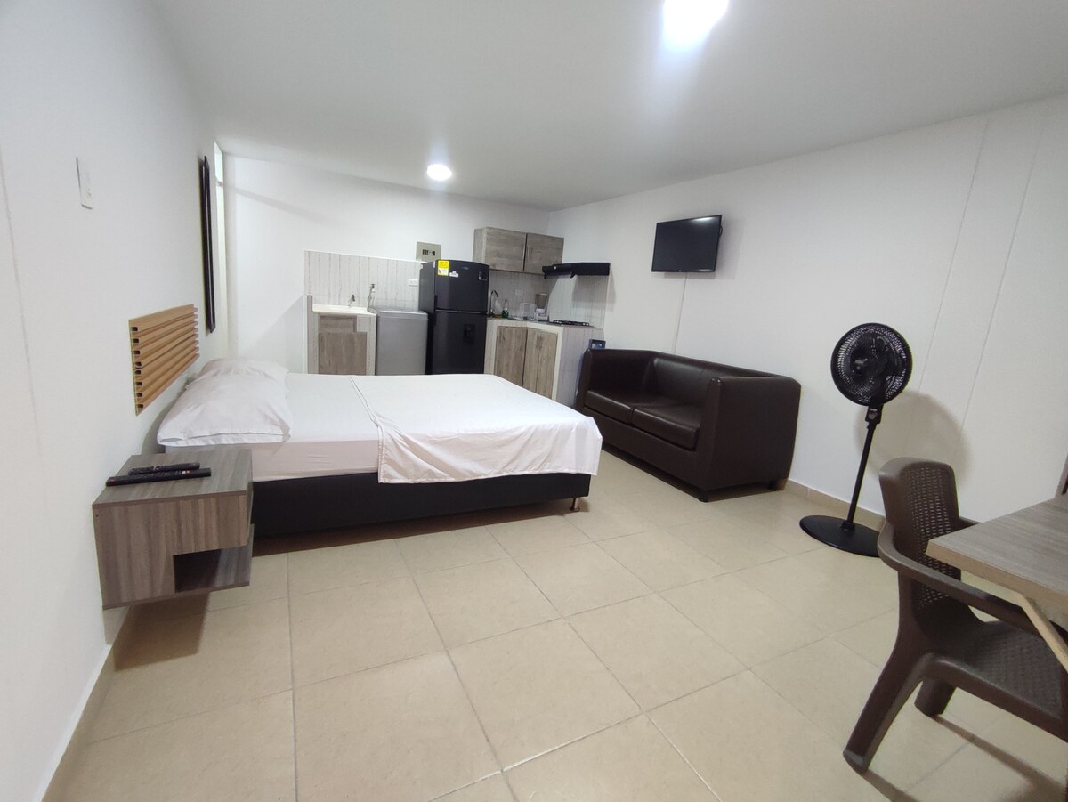 Njut av en vistelse i Bucaramanga Nära skoindustrins industriområde; Alfonso Lopez stadion, UIS. 5 minuter från Comuneros-kliniken och HUS, och 10 minuter från stadens affärscentrum, köpcentrum, stormarknader. Loftlägenheten består av en enda miljö, ett rum med dubbelsäng och arbetsområde; matsal med hopfällbar bäddsoffa, TV-rum med 43" smart-TV, arbetsområde med kraftfullt WiFi, integrerat kök, klädutrymme och 1 badrum