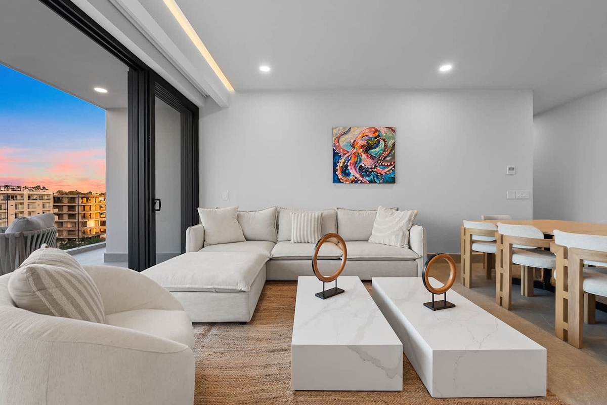 A great value in Golden Zone, Udara PH-E is a 3-bedroom condo on the 7th floor of Udara — Bucerías' most amenity-rich beachfront tower — with mountain and city views from every room. Sleeps up to 10 guests. The Udara amenity stack is what sets it apart: rooftop and beachfront heated pools, sauna, padel court, rooftop lounge and games room, daily housekeeping, on-site restaurant, spa, EV charging, gym, and private boat charters.