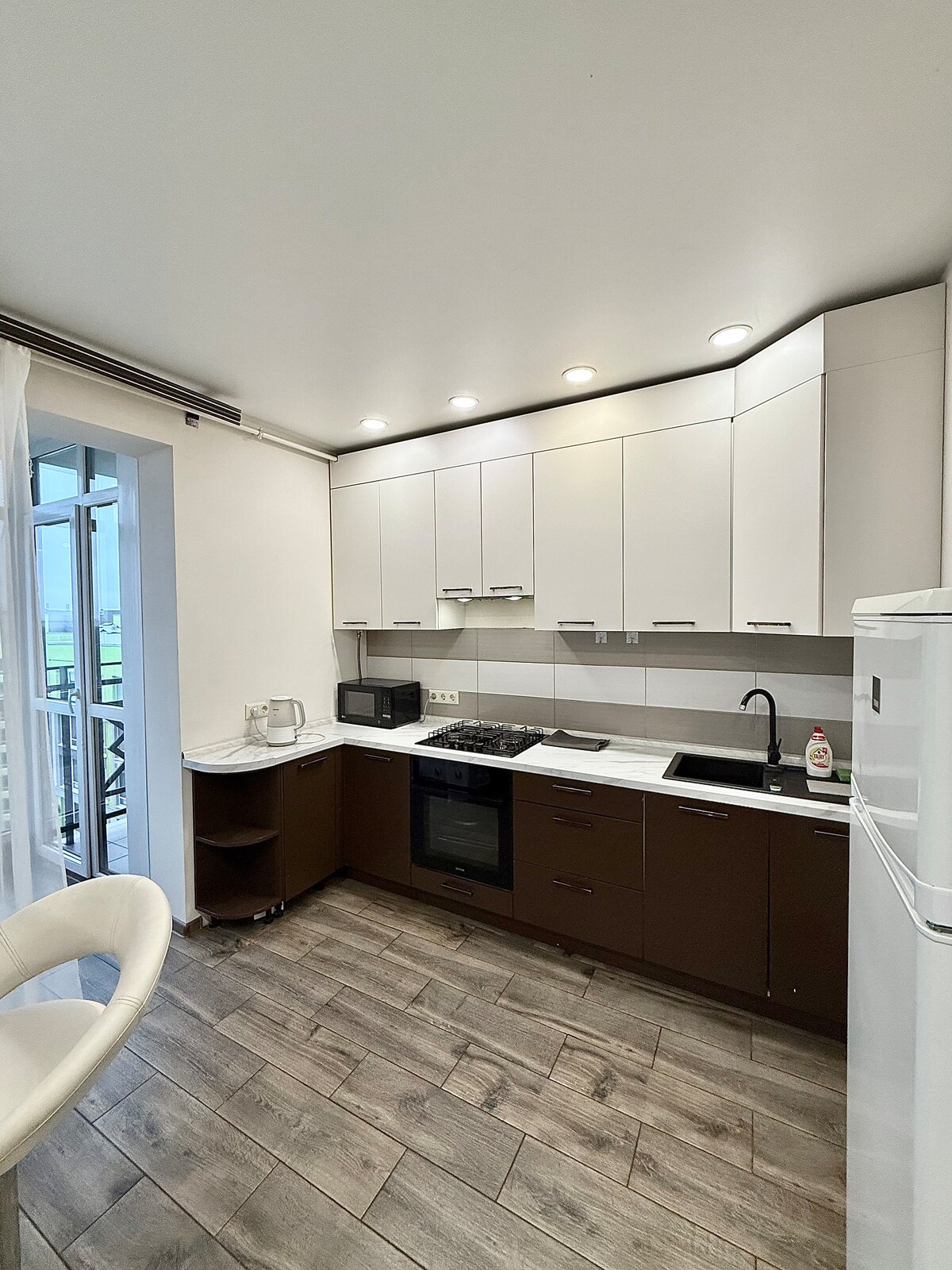 Комфортна студія на 4 спальних місця. WiFi Смарт TV Кондиціонер Тепла підлога Балкон Барна стійка Газова плита Духова шафа Мікрохвильовка Посуд Білизна Рушники Пральна машина Фен Праска Гарний двір Закрита територія під охороною Заїзд цілодобово