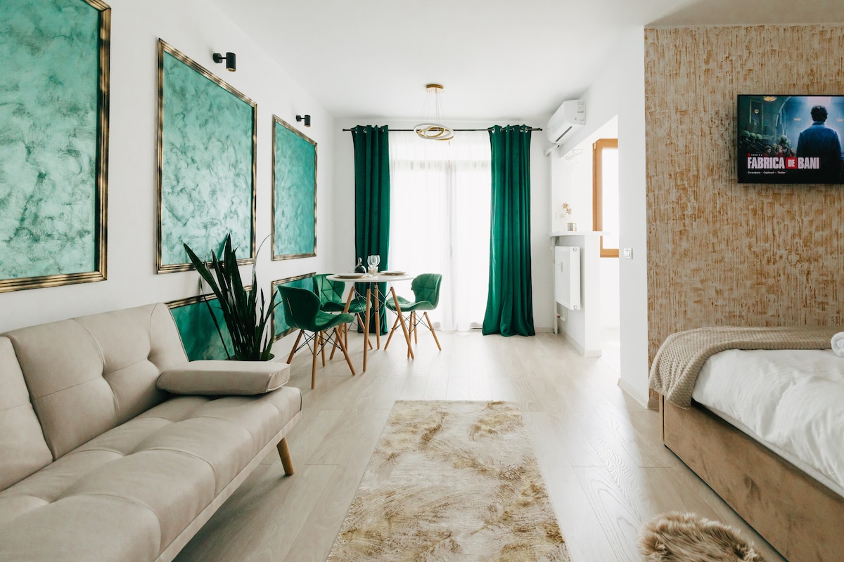 Golden Parkside Studio – Koppla av med stil Beläget i ett område nära centrum, mellan flera intressanta platser i staden, erbjuder studion den perfekta blandningen av komfort och stil, avkoppling och olika aktiviteter tillgängliga. ~ Rymlig och ljus studio, uppdelad i flera sittplatser ~Fullt utrustat kök ~Badrum med moderna faciliteter ~ Gratis WiFi och Smart TV för underhållning ~Läge nära kollektivtrafik och lokala sevärdheter