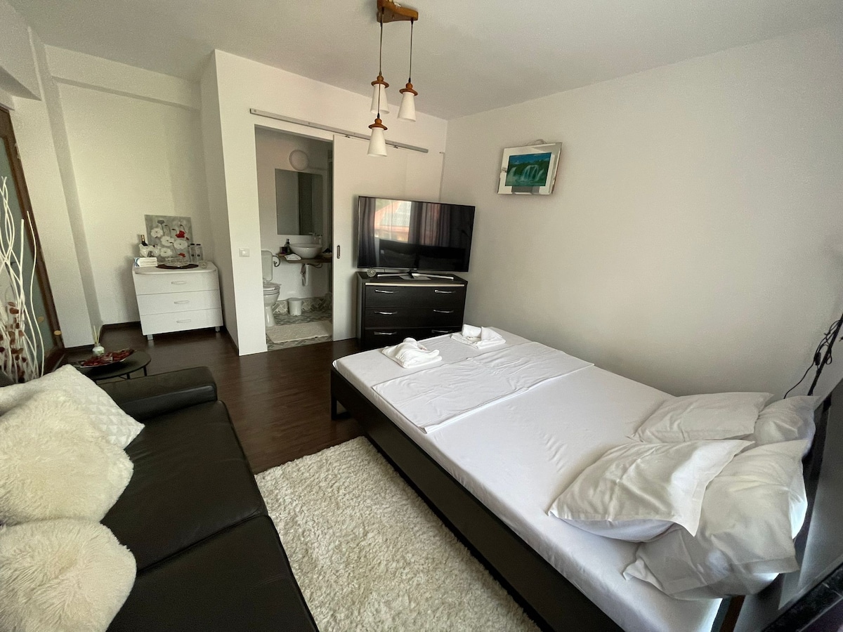 Humble Abode är vårt vackra nyligen renoverade pensionat. Denna fridfulla, mysiga och fulla av ljus nya studio är det perfekta skyddet, efter en lång arbetsdag, promenader eller hänga i Bukarest. Du hittar en bar i vardagsrummet, en bekväm queen madrass i sovrummet och ett avkopplande badkar i det privata badrummet. En giltig ID-handling krävs före incheckning för registreringsändamål. 2 minuters promenad till stormarknaden 2 minuters promenad är buss 117 till centrum 15 minuter med bil till centrum