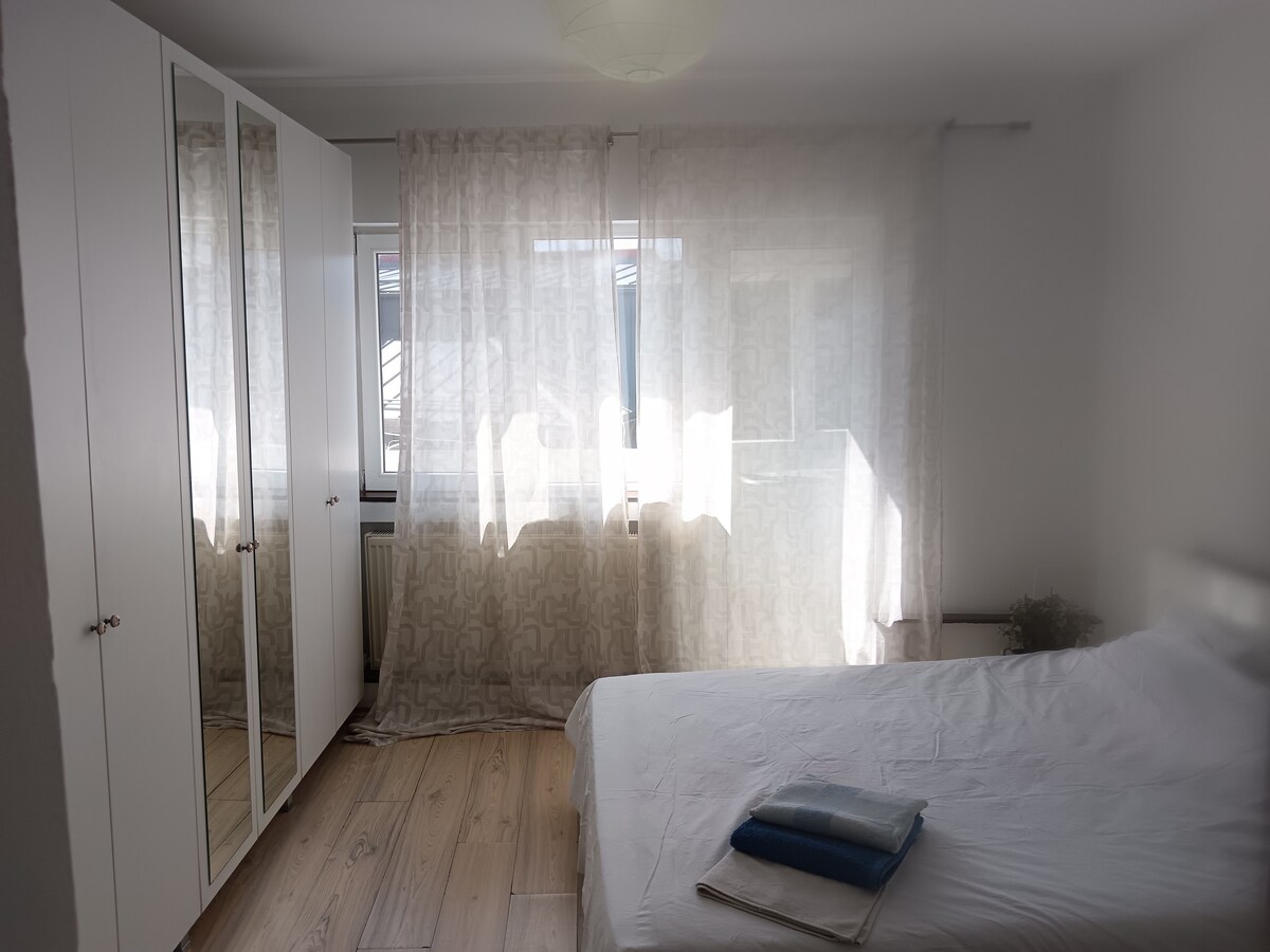 Ljus lägenhet på 4:e våningen med balkong till båda rummen, plus glasvägg med vacker utsikt över Foisorul de Fire Museum. Sovrum med skrivbord, mörkläggningsgardiner och omklädningsrum; vardagsrum med dubbelsäng + bäddsoffa; separat fullt utrustat kök med bordsområde och tvättmaskin; badrum med badkar. I närheten: Internationella restauranger, kaféer, bistroer, push-tava, de flesta banker med filialer och många växlingskontor. Snabbt WiFi och trädgård för avkoppling.