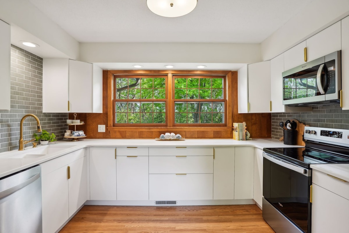 Urban Zen retreat; unik mitten av århundradet modern möter Japan i ett bra grannskap fullt av arkitektoniska pärlor. Uppdaterad 1950-tals arkitektbyggd passiv-sol konstnärs retreat hem, omgiven av träd och japanska trädgårdar. Avslappnad komfort långt ifrån steril, fylld med konst. Fullständig lugn 10 minuter från centrala Mpls och mycket nära till både U of MN campus. Livligt, vänligt område på gångavstånd till mataffär, presentbutiker, vinbutik, yogastudio, kaféer och bra restauranger.