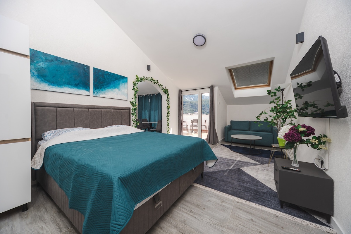 Denna vackra takvåning med två våningar är perfekt om du vill njuta av ljus, utrymme och fantastisk utsikt över havet, bergen och staden. Stort vardagsrum/matsal och kök, tre sovrum, två badrum och balkong med utsikt över Budva. Inredningen är elegant och hemtrevlig. Möbler skräddarsydda. Läge? Fantastisk – lugn bostadsgata på sluttningen, nära till allt. 10-15 minuters promenad till stranden och Gamla stan. Bäst för familjer eller två par. Kan vara värd upp till 6 vuxna.