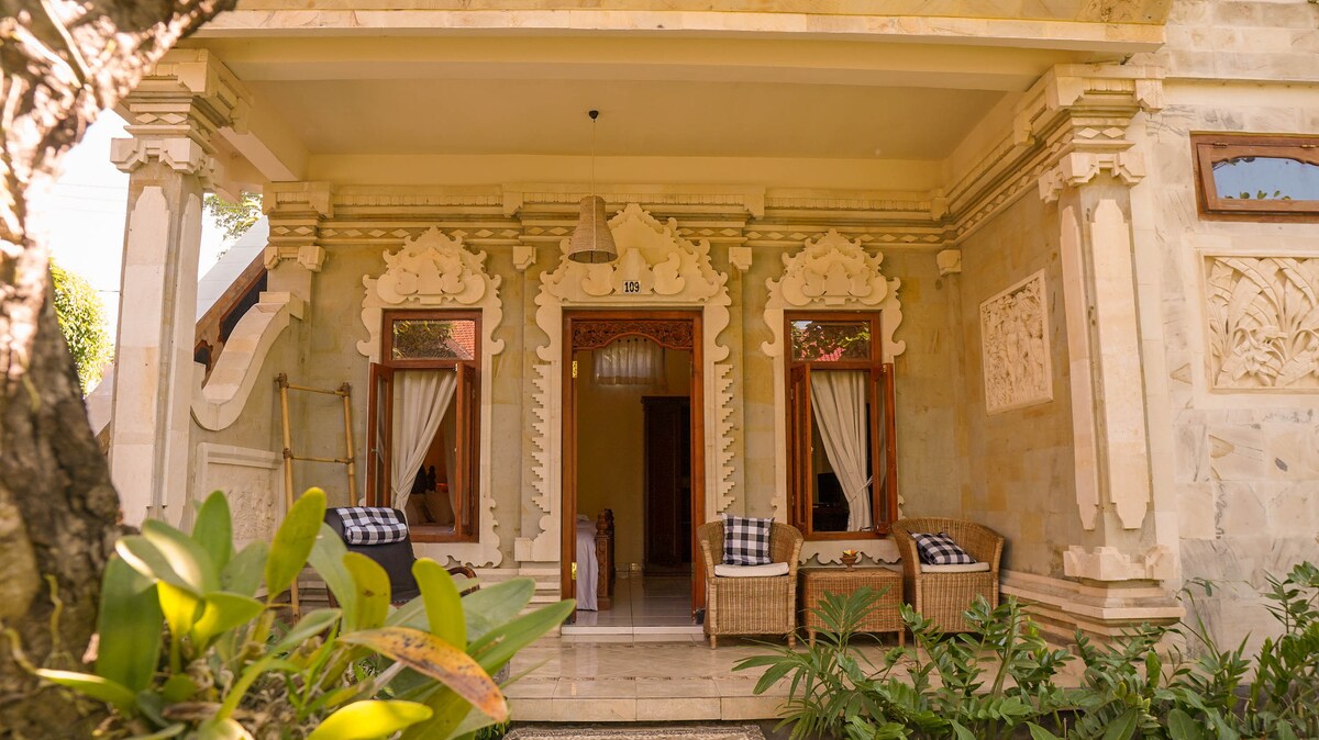Fördjupa dig i traditionell design och komfort, komplett med fräscha sängkläder och handdukar, A/C och bekväma sängar för en perfekt natts sömn. Varje rum har ett skåp och handdukshängare, samt en privat uteservering för avkoppling. Ta en snabb två minuters promenad till stranden, där du kan se lekfulla delfiner, eller äta på de läckra närliggande restaurangerna och Warungs. Missa inte närliggande attraktioner som hisnande vattenfall och fantastiska tempel.