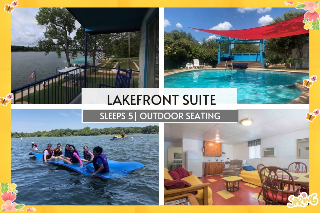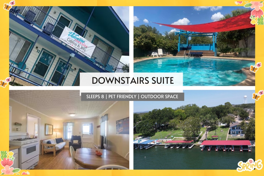 Welcome to Lakefront Suite 12 at Valentine Lakeside, part of the charming Lakefront Suites Collection — a two-story quadplex overlooking beautiful Lake LBJ. The Upper-Level Suites are conveniently located at ground level with easy access from the parking area, while the Lower-Level Suites, like Suite 12, sit just below, accessible by a short walkway that gently slopes toward the water’s edge.