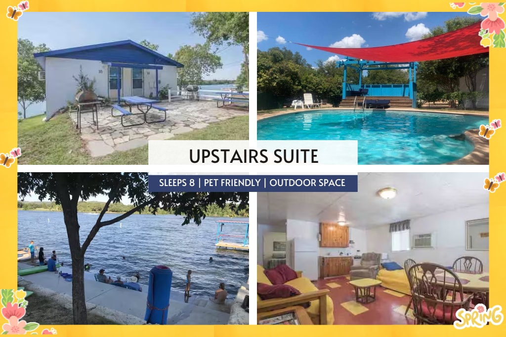 Welcome to Lakefront Suite 15 at Valentine Lakeside, part of the charming Lakefront Suites Collection — a two-story quadplex overlooking beautiful Lake LBJ. The Upper-Level Suites, like Suite 15, are conveniently located at ground level with easy access from the parking area, while the Lower-Level Suites sit just below, accessible by a short walkway that gently slopes toward the water’s edge.