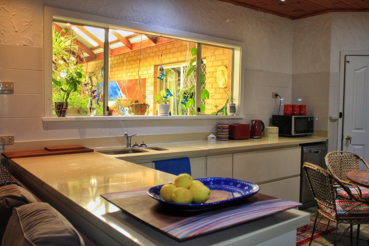 Broadwater naturreservat, 10 minuter att gå till stranden och Dolphin båtramp, 10 minuter till Busselton CBD och Jetty med bil, och 20 minuter till vinregionen och populära surfkusten. Huset är ett bekvämt familjehem med 2 sovrum tillgängliga med king och queen size-sängar, en extra utfällbar säng om det behövs, fläktar i varje rum, klädförvaring och dina sängkläder och handdukar tillhandahålls. Ett badrum med separat badkar och duschutrymme. Fullt fristående kök, en Alfresco område gräsmatta bakgård och en