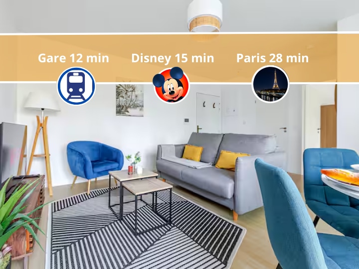 💫 Bienvenue Disney Family 💫 Appartement à seulement 13 min de Disney en voiture ! Logement chaleureux et fonctionnel. Ici, tout est pensé pour que petits et grands rêveurs partagent des instants de complicité 💞, avant ou après une journée remplie de magie ! • Parking gratuit • Entrée autonome possible après le parc Disney où un long voyage • Ménage réalisé par nos soins : vous êtes en vacances ✨ 💖Offrez à votre famille un séjour inoubliable ! ATTENTION Pas de transports publics
