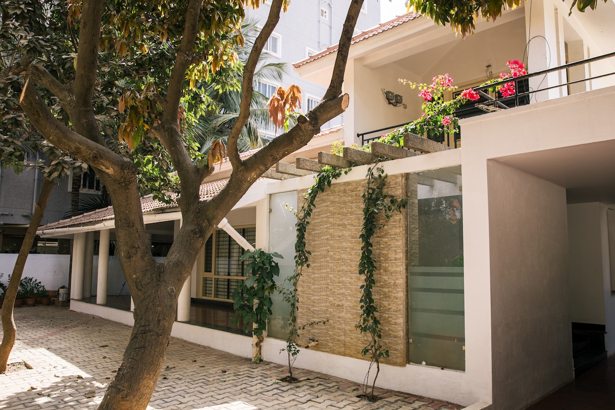 Du kommer inte att glömma din tid på detta romantiska, minnesvärda ställe. Det är en helt ny studiolägenhet med enorma franska glasdörrar och fönster med utsikt över det livliga surret i Namma Bengaluru City. Ändå omgiven och helt täckt med så mycket grönska att du knappt kan se takvåningen från utsidan. Det är ett mycket mysigt ställe i sitt slag. Med alla bekvämligheter för att göra din vistelse värd och minnesvärd för att ta tillbaka härliga minnen av Bengaluru med dig.