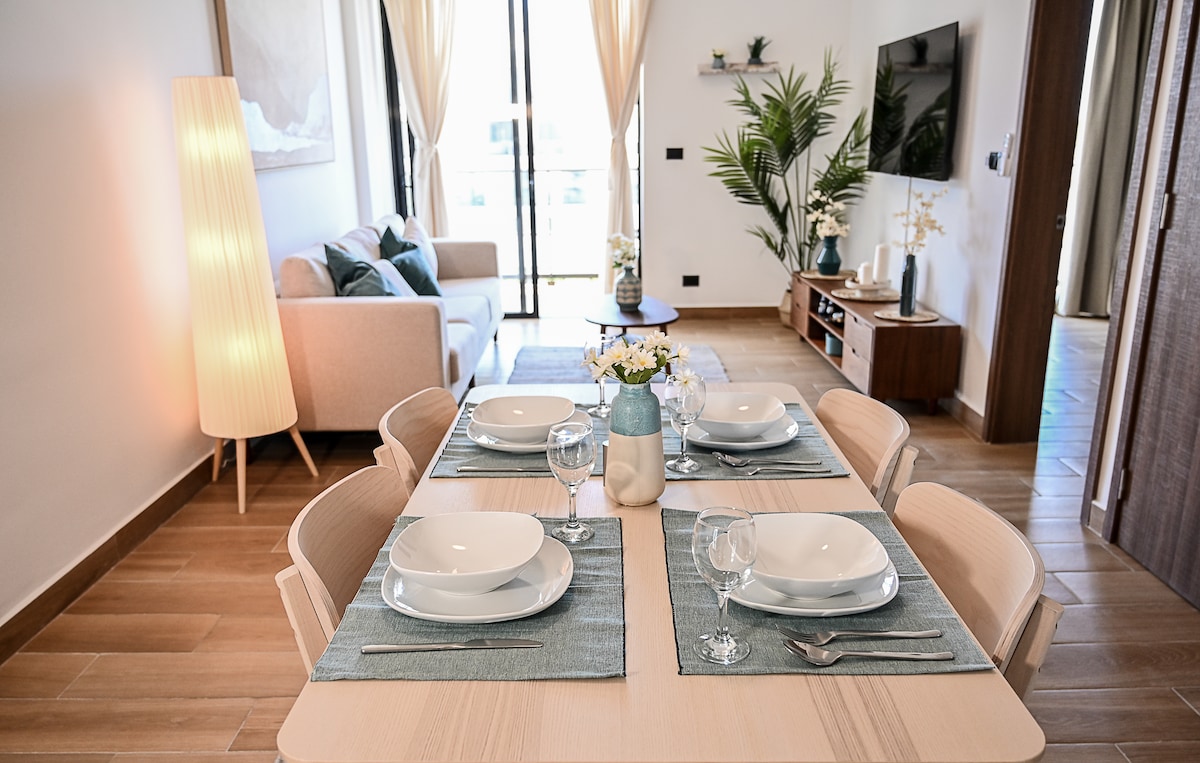 Vacker exklusiv lägenhet med balkong, privat trädgård och jacuzzi. Det ligger inom ett exklusivt och säkert bostadsområde, bara 15 minuter från flygplatsen och 8 minuter från Downtown, där du kan njuta av den berömda Coco Bongo nattklubb, restauranger och stormarknader. Inne i komplexet har du konstgjord strand och en strandklubb med utmärkt gastronomi. Det perfekta boendet för par, ensamma resenärer eller affärsresenärer, som erbjuder en upplevelse som kombinerar komfort, stil och avkoppling
