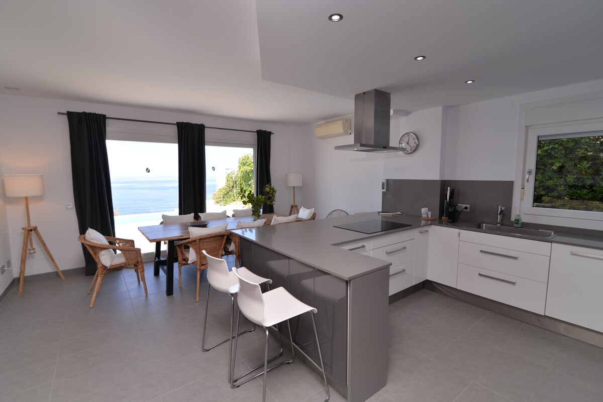 Vacker duplex (bottenvåning och våning 1) vid havet. ALLA HÖGKVALITATIVA BEKVÄMLIGHETER. HELT FÖRNYAD NYLIGEN. Möbler och faciliteter av senaste generationen. OSLAGBART LÄGE. FÖRSTA RADEN MED SPEKTAKULÄR UTSIKT. 5 minuters promenad till stranden. Stor egen terrass och fantastisk utsikt. Lugnt och familjeorienterat komplex, gemensam pool, säkert område för bilparkering, solarium och stegar vid klipporna för havsbad. Luftkonditionering och WIFI.