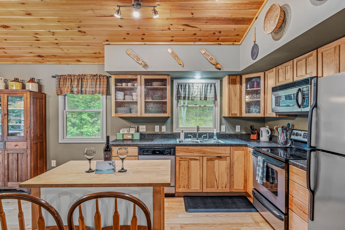 Dove's Nest har ett sovrum med dubbelsäng och plysch sängkläder. Anpassade hickoryskåp, hickorygolv och anpassade amerikanska tillverkade cederträ möbler dekorerar stugan. Koppla av på Lazy Boy-möblerna i det stora rummet och njut av den fantastiska gaseldstaden från golv till tak. Badrummet har ett stort bubbelbadkar och en duschkabin. Extra sängkläder finns tillgängliga för barn på begäran.